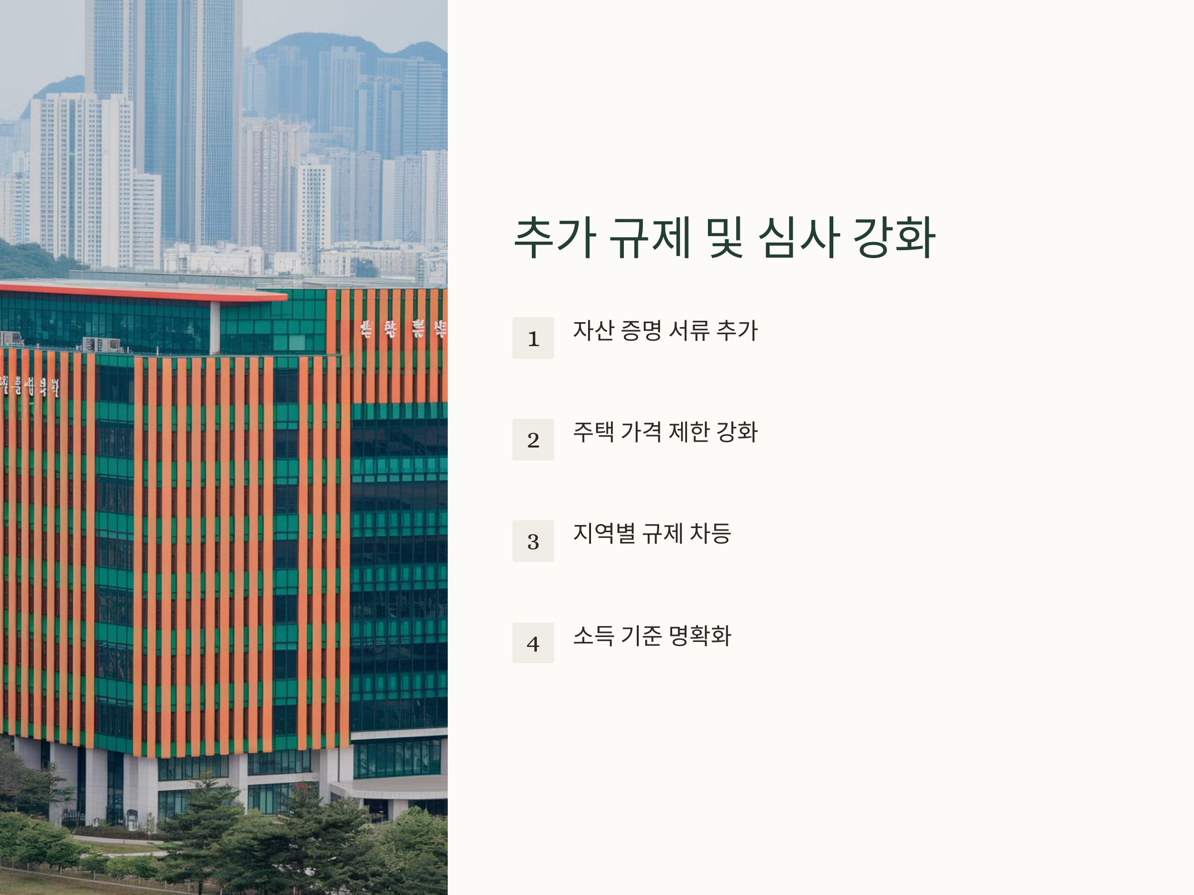특히, 대출 금액과 관련된 규제가 강화되었고, 소득 기준과 자산 심사 조건이 명확하게 설정되면서, 더 많은 실수요자들이 대출을 받을 수 있는 기회를 가지게 되었습니다. 그러나 이러한 변화가 대출을 받는 데 있어 어려운 상황을 초래할 수도 있으므로, 신청 전에 자신의 조건을 꼼꼼히 체크하는 것이 중요합니다【13†source】.