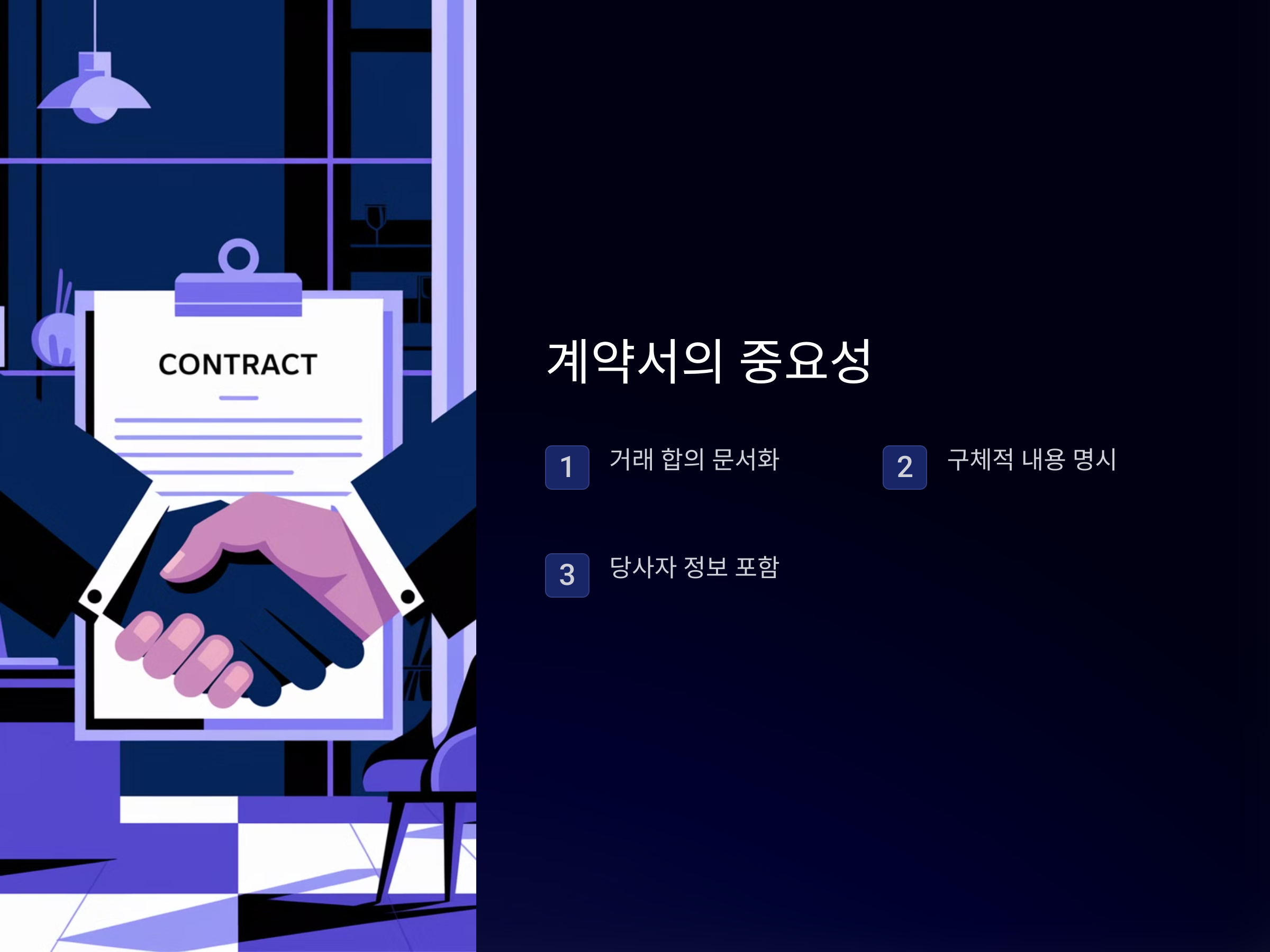 계약서에는 다음과 같은 항목이 포함되어야 합니다: