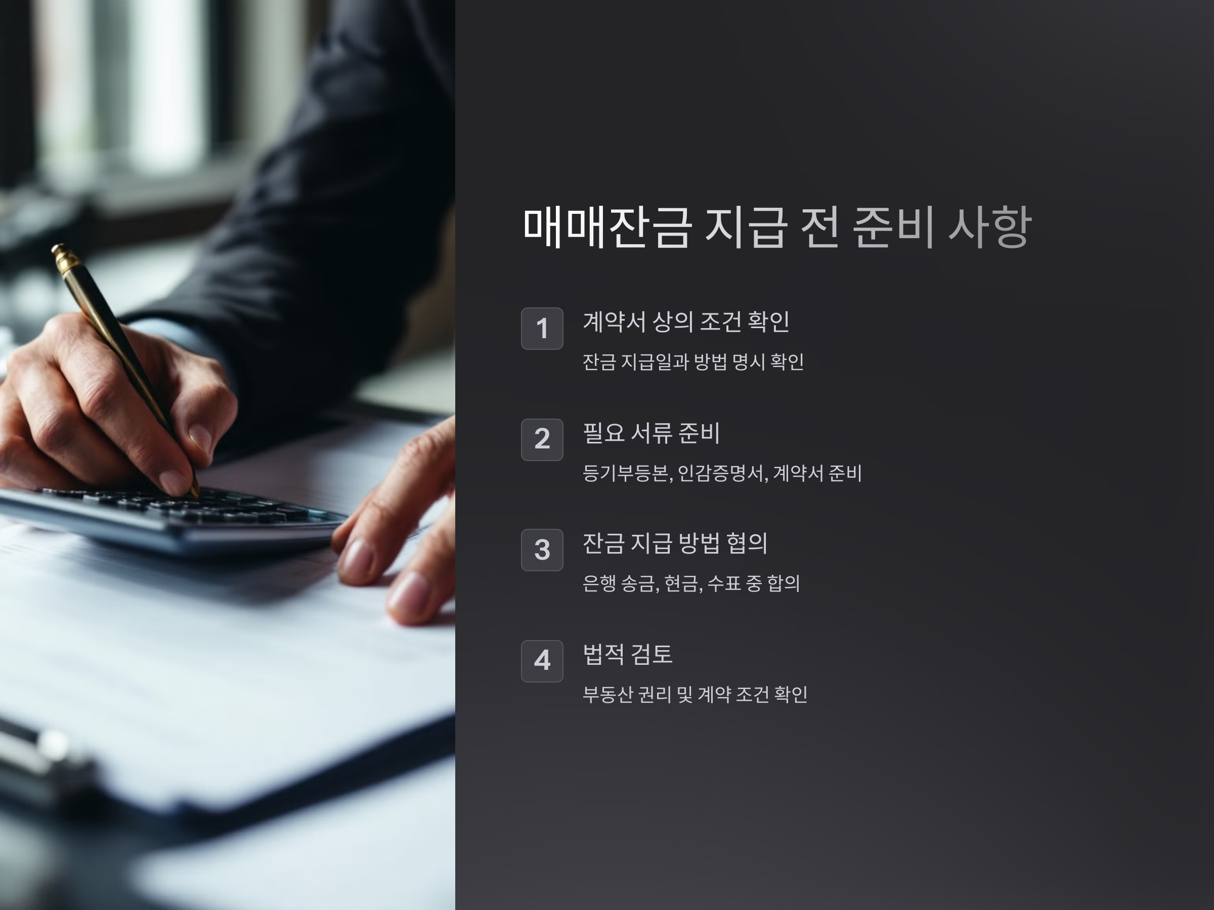 매매잔금 지급은 거래를 마무리 짓는 중요한 과정이므로, 꼼꼼하게 점검하고 주의 깊게 진행해야 합니다.
