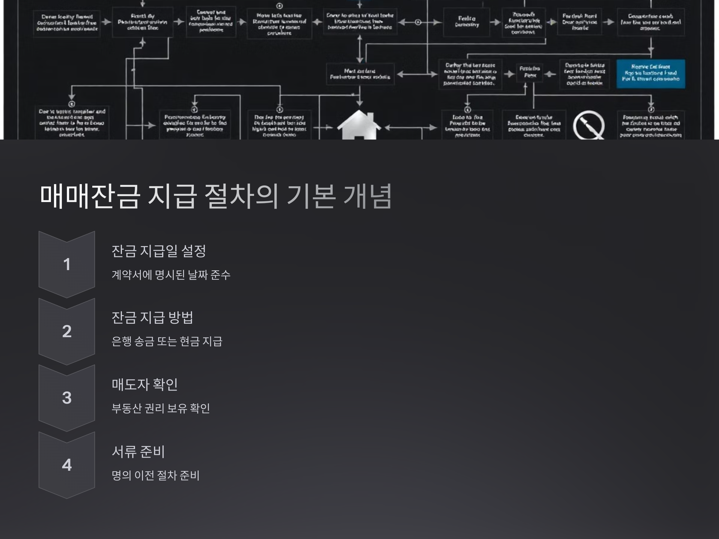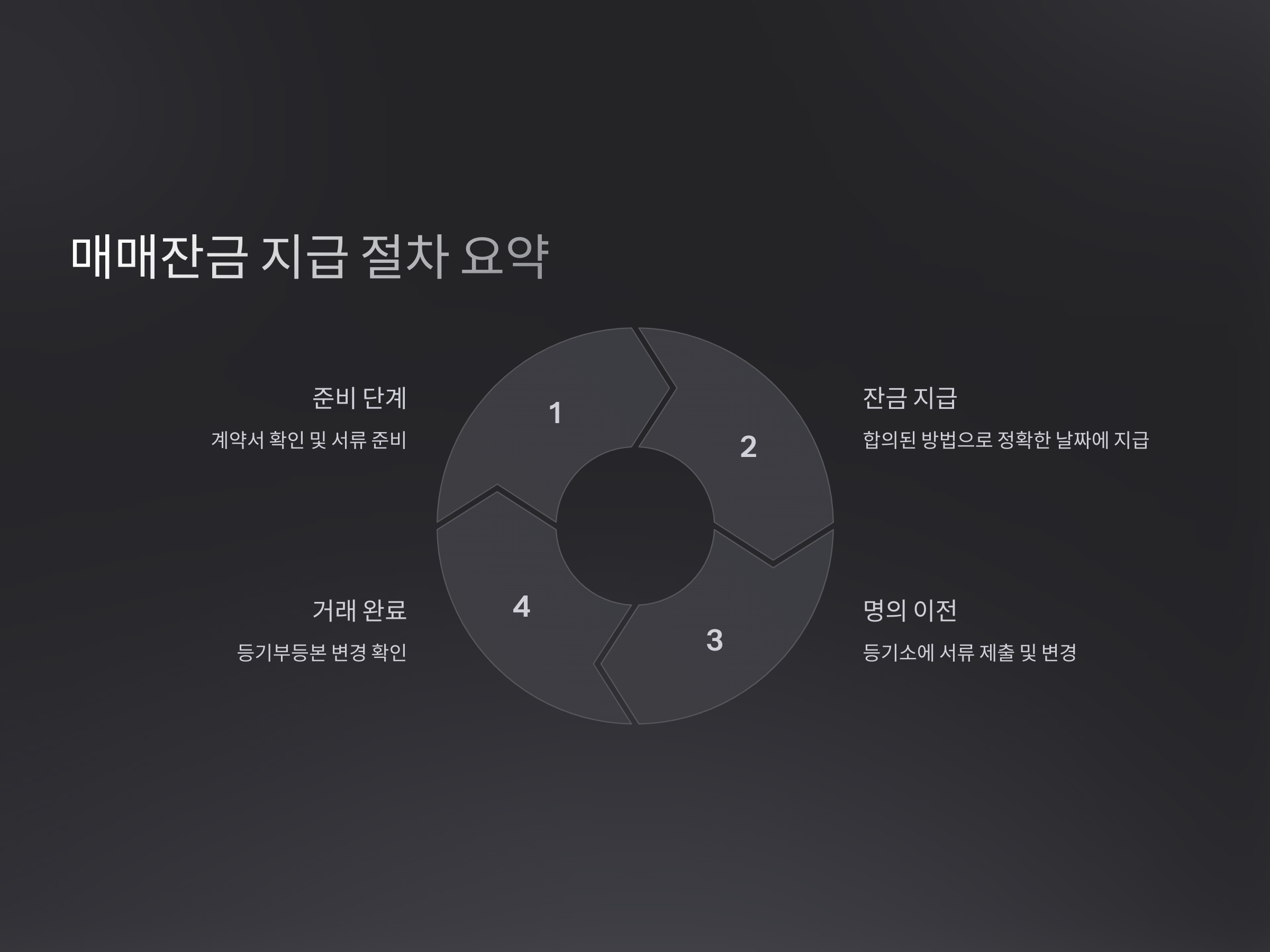 매매잔금 지급 절차는 다음과 같은 단계로 나뉩니다: