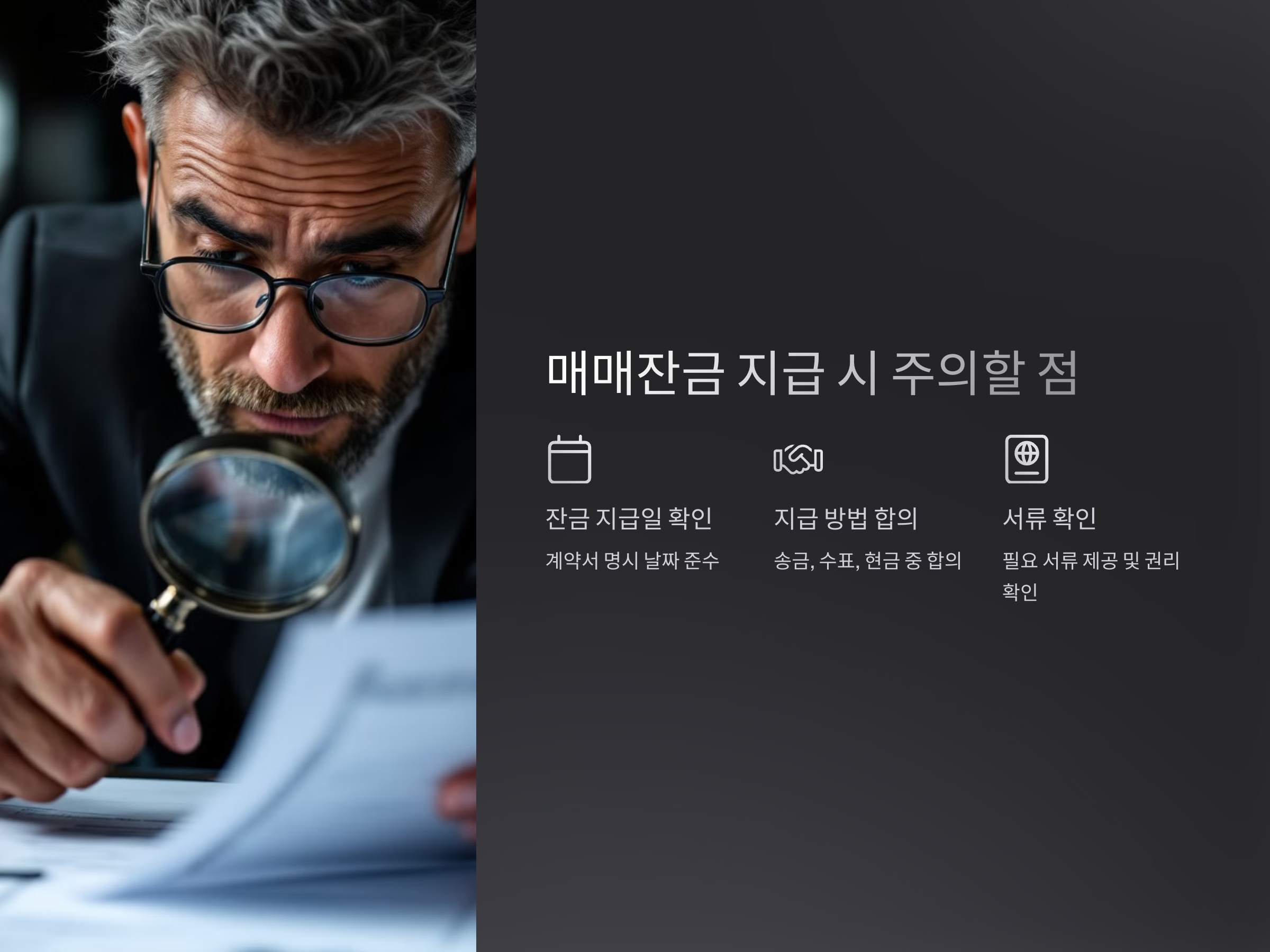- 계약서 상의 조건 확인: 매매 계약서에 잔금 지급일과 방법이 정확히 명시되어 있어야 하며, 이를 확인한 후 잔금 지급 계획을 세워야 합니다.