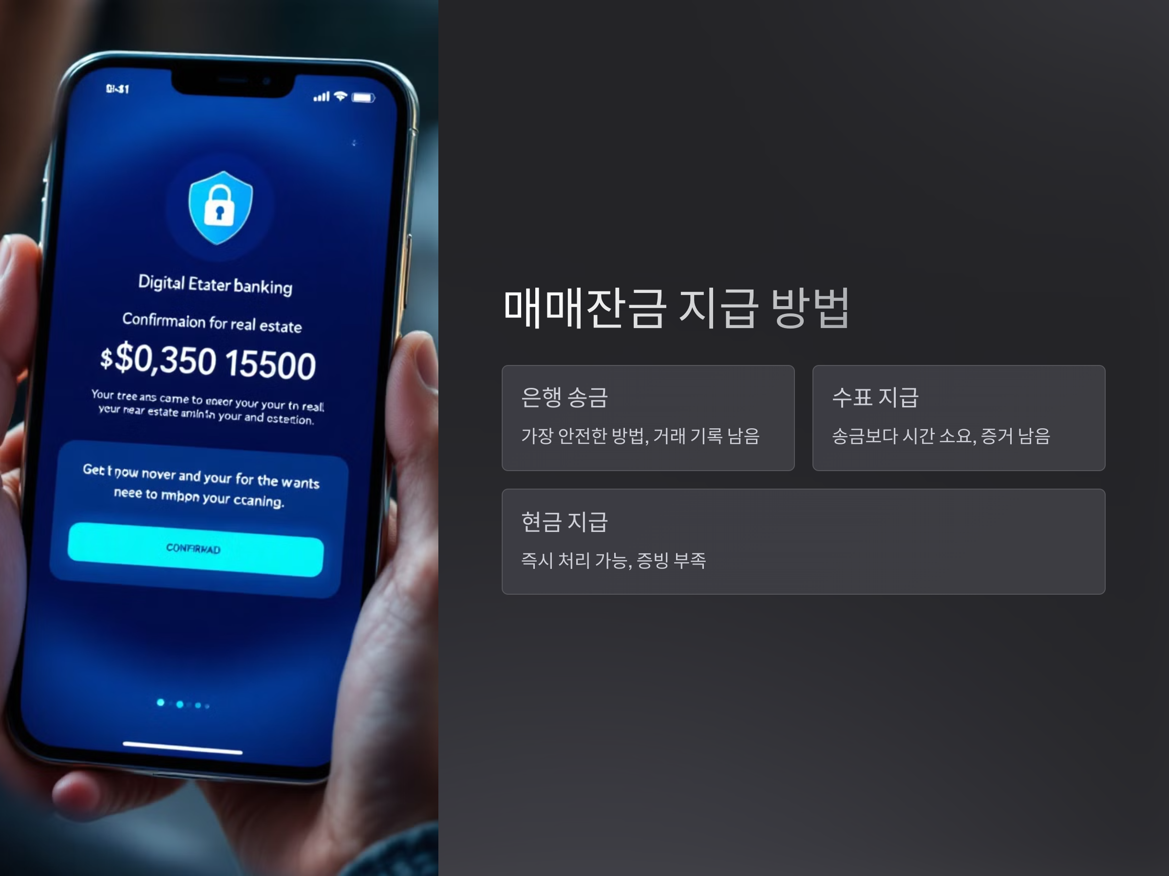 - 은행 송금: 가장 일반적인 방법으로, 매수자는 매도자의 은행 계좌로 잔금을 송금합니다. 이 방법은 추후 분쟁이 발생했을 때 송금 기록을 통해 확인할 수 있어 안전합니다.