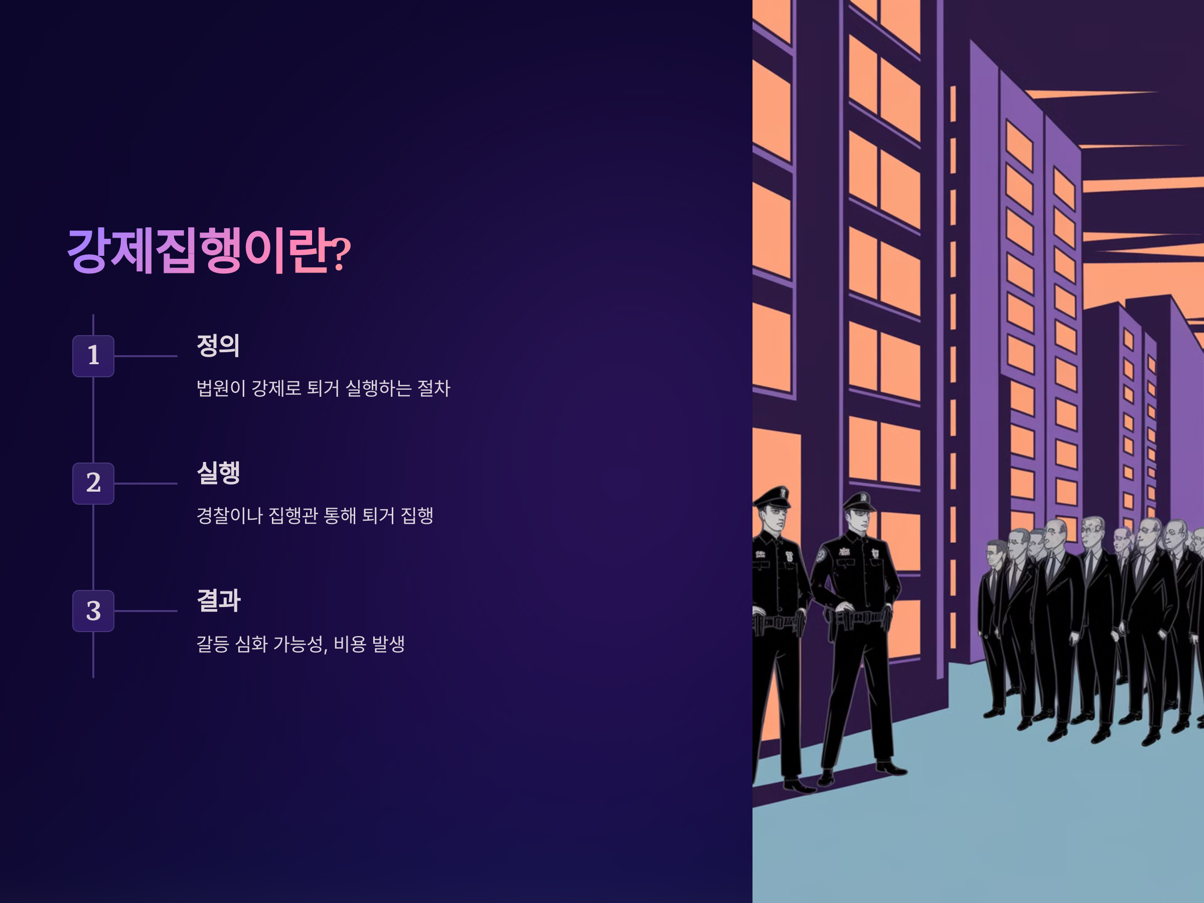 - 강제집행 실행: 법원은 집행관을 통해 강제집행을 실행하고, 경찰이 이를 지원할 수 있습니다.
