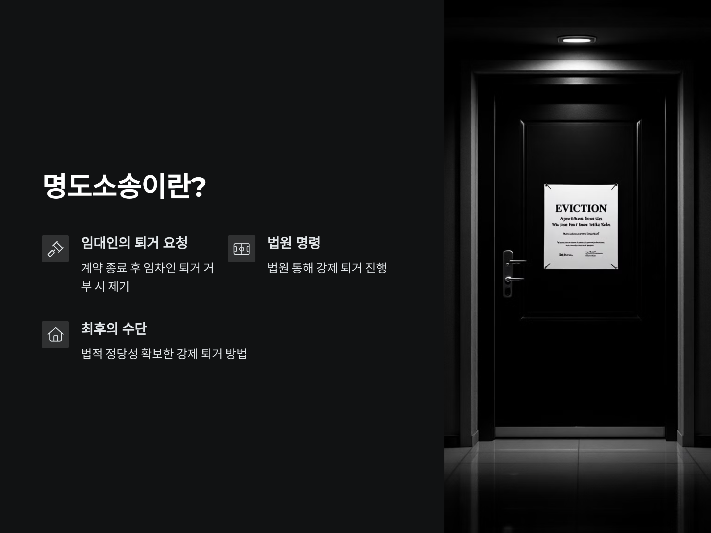 명도소송은 임대차 계약의 종료 시점에 임차인이 퇴거하지 않을 경우에 발생합니다. 이 절차는 법원에 소송을 제기하고 법원 명령을 통해 임차인을 강제적으로 퇴거시키는 방법입니다. 법적인 정당성을 확보하고, 실질적으로 임차인의 거주를 종료시키기 위한 최후의 수단으로 사용됩니다.