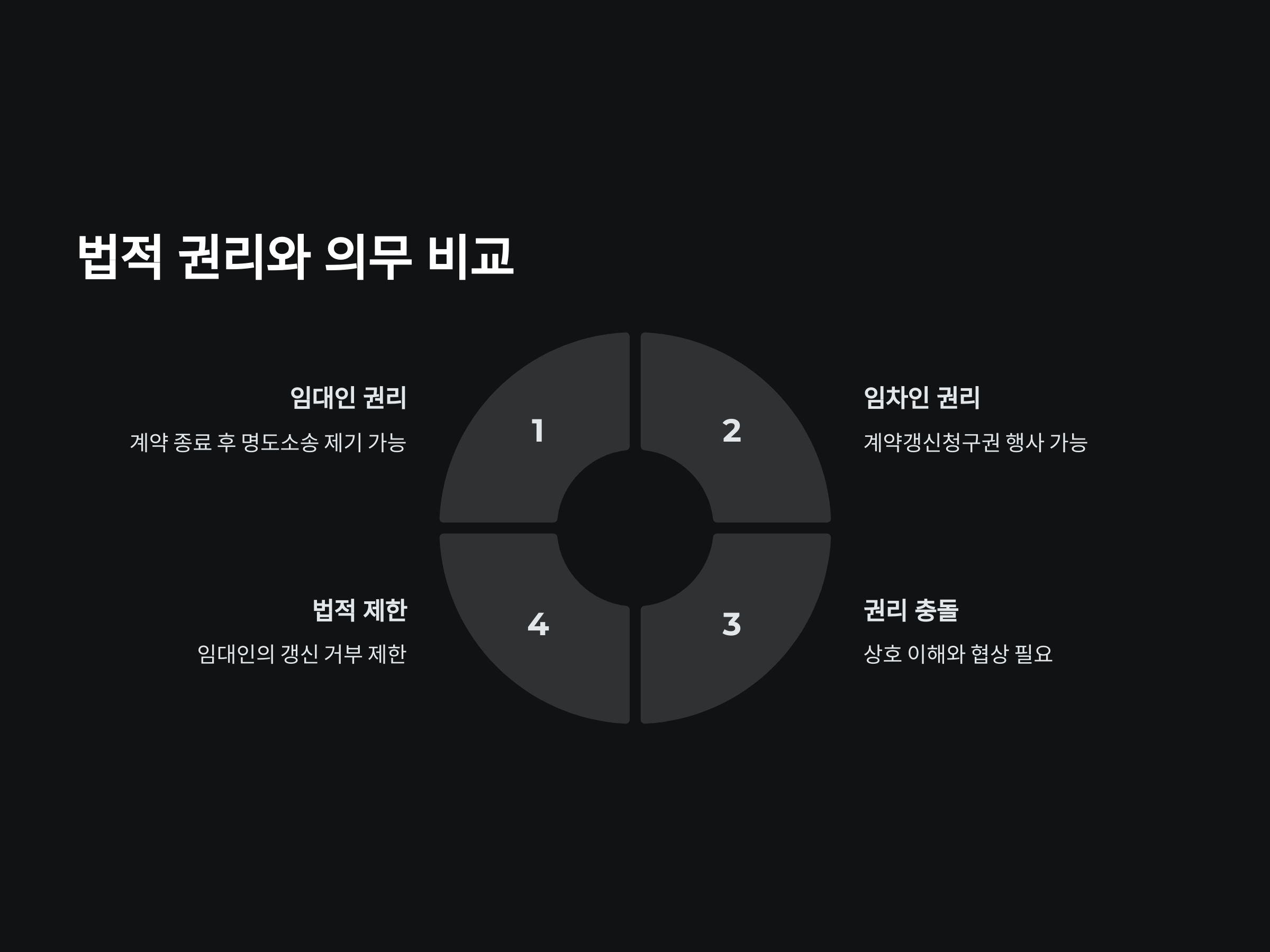따라서 임대인과 임차인은 각자의 권리와 의무를 충분히 이해하고, 이러한 법적 절차가 발생하기 전에 협상과 상호 이해를 통해 해결하는 것이 중요합니다. 특히, 계약갱신청구권을 통해 임차인이 계약을 연장하려는 경우, 임대인이 이를 거부할 수 없다는 점을 염두에 두어야 합니다.