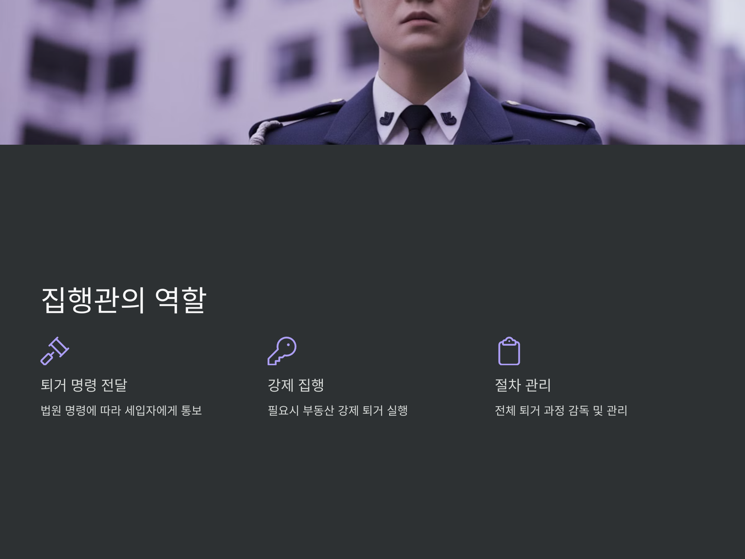 이 과정에서 집행관이 중요한 역할을 합니다. 집행관은 법원의 명령에 따라 세입자에게 퇴거 명령을 전달하고, 필요시 강제집행을 통해 실제로 부동산을 비우는 역할을 담당합니다.