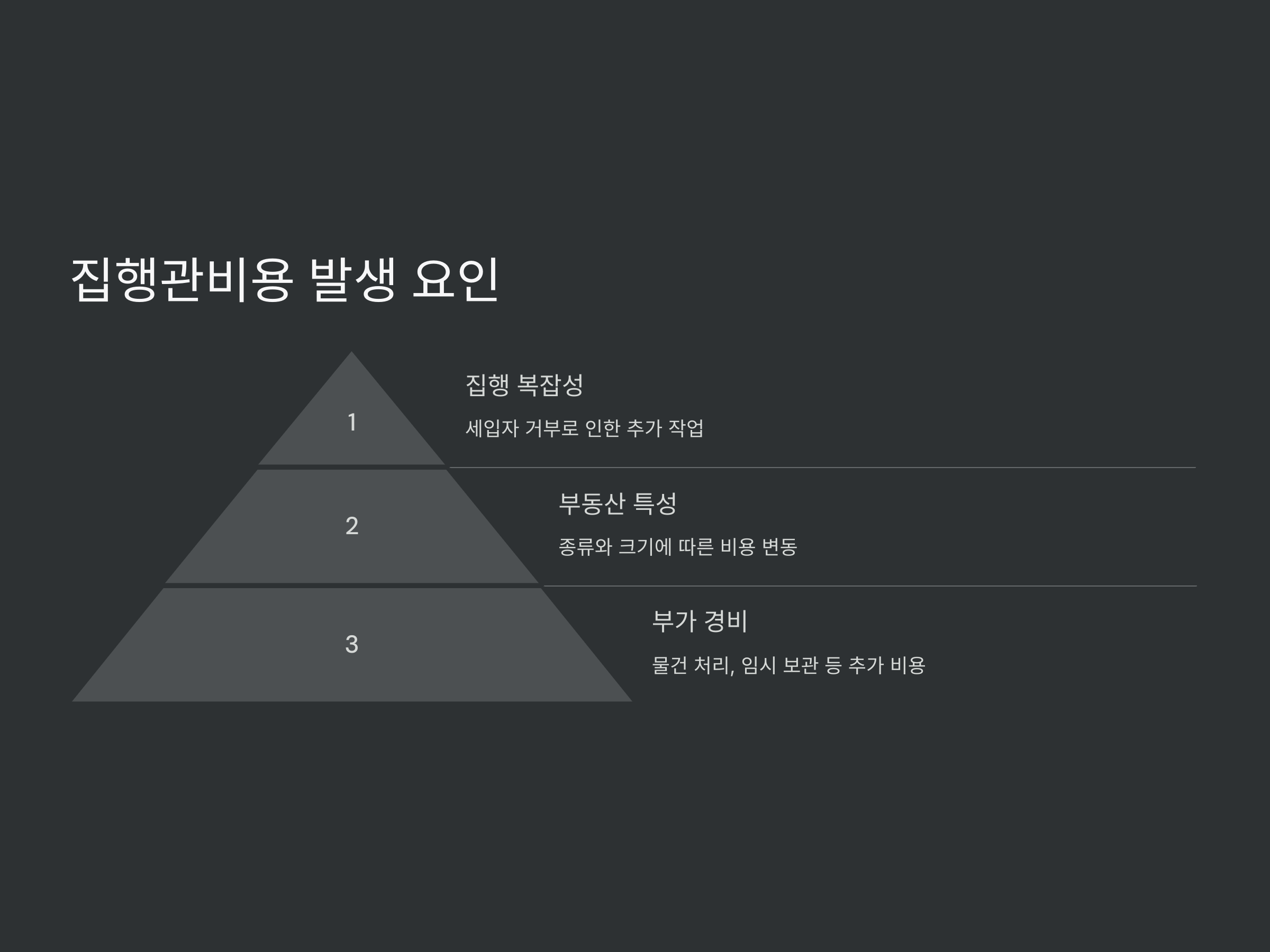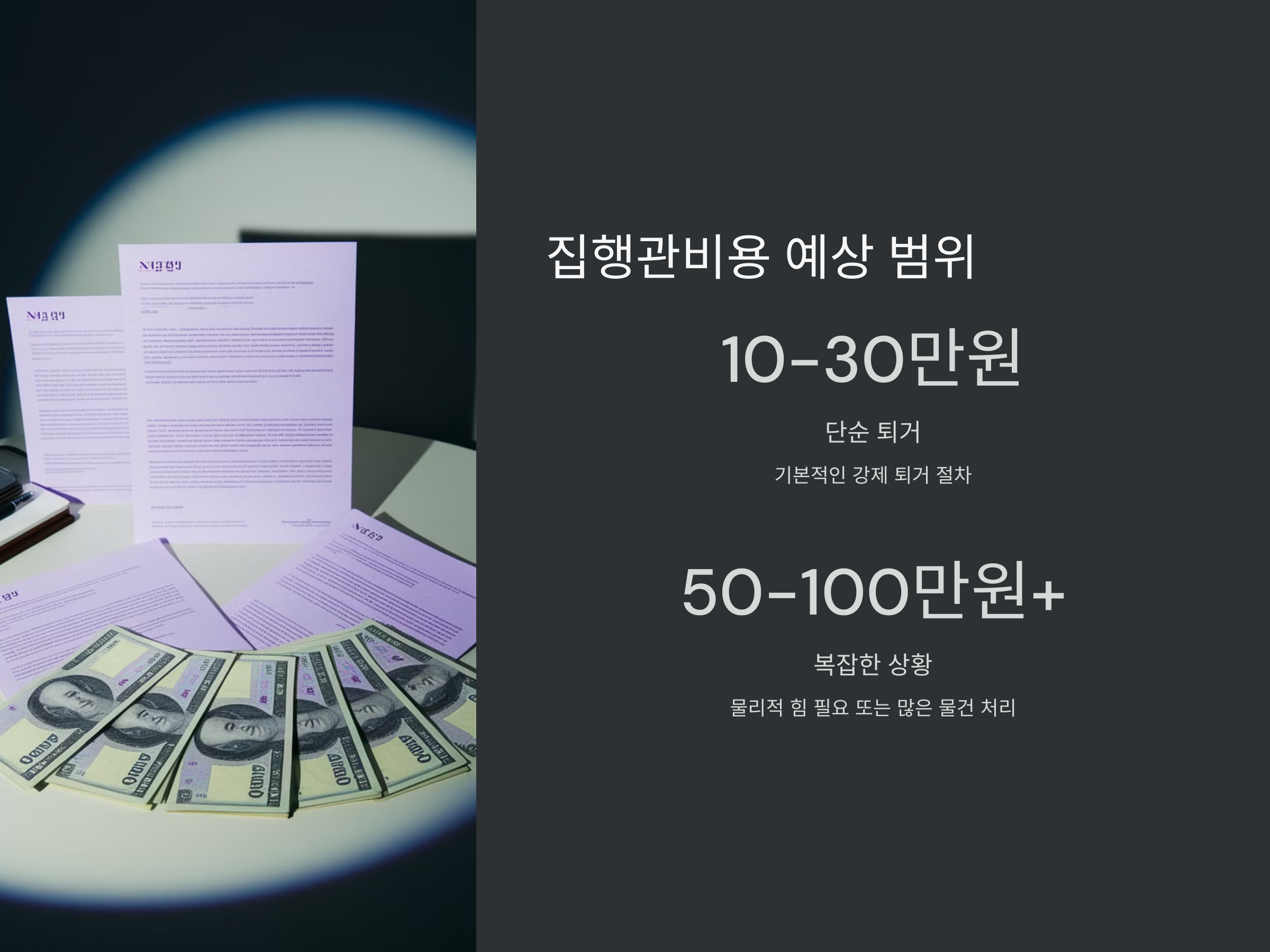- 집행과정에서 발생하는 경비도 고려됩니다. 예를 들어, 물건을 처리하거나 부동산을 점유하고 있던 세입자의 물건을 임시로 보관하는 데 드는 비용 등이 추가될 수 있습니다.