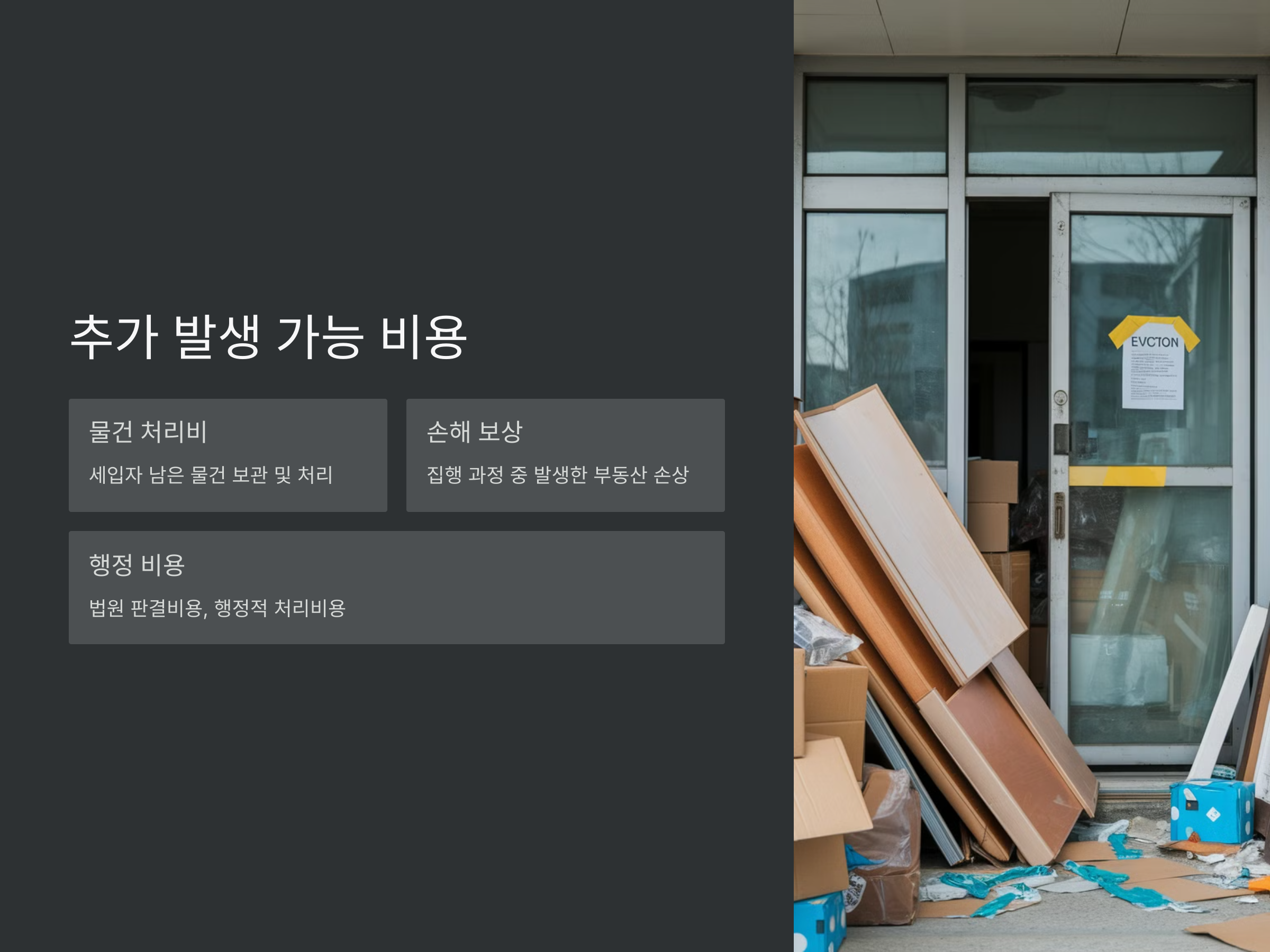 명도소송을 진행한 후, 집행관비용 외에도 여러 가지 추가 비용이 발생할 수 있습니다. 예를 들어, 퇴거가 완료된 후 세입자가 남긴 물건을 처리해야 하는 경우, 물건 보관료와 처리비용이 추가로 발생할 수 있습니다. 또한, 집행 과정에서 발생하는 부동산의 손상이나 손해에 대한 보상이 필요할 수 있습니다.