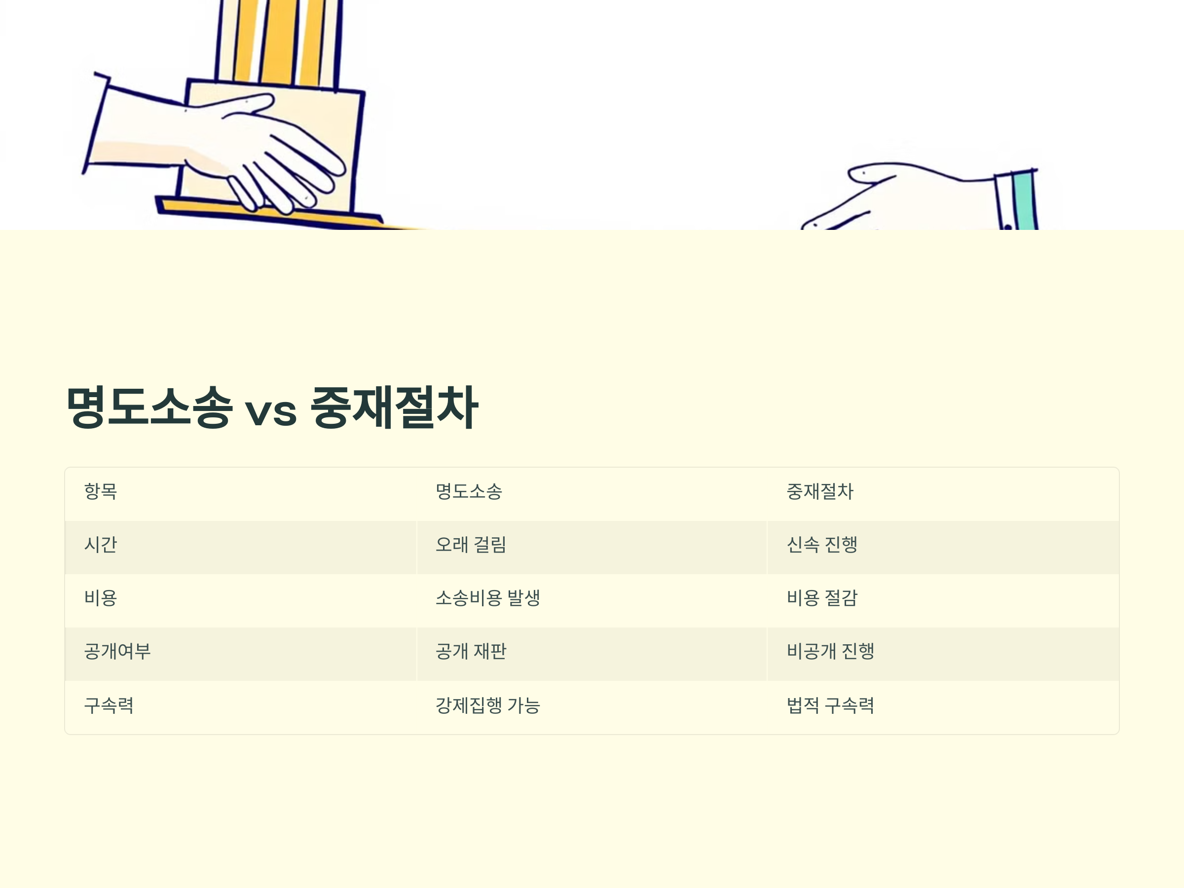 | 구속력 | 법원의 판결로 강제 집행 가능 | 중재 결정에 법적 구속력 있음 |