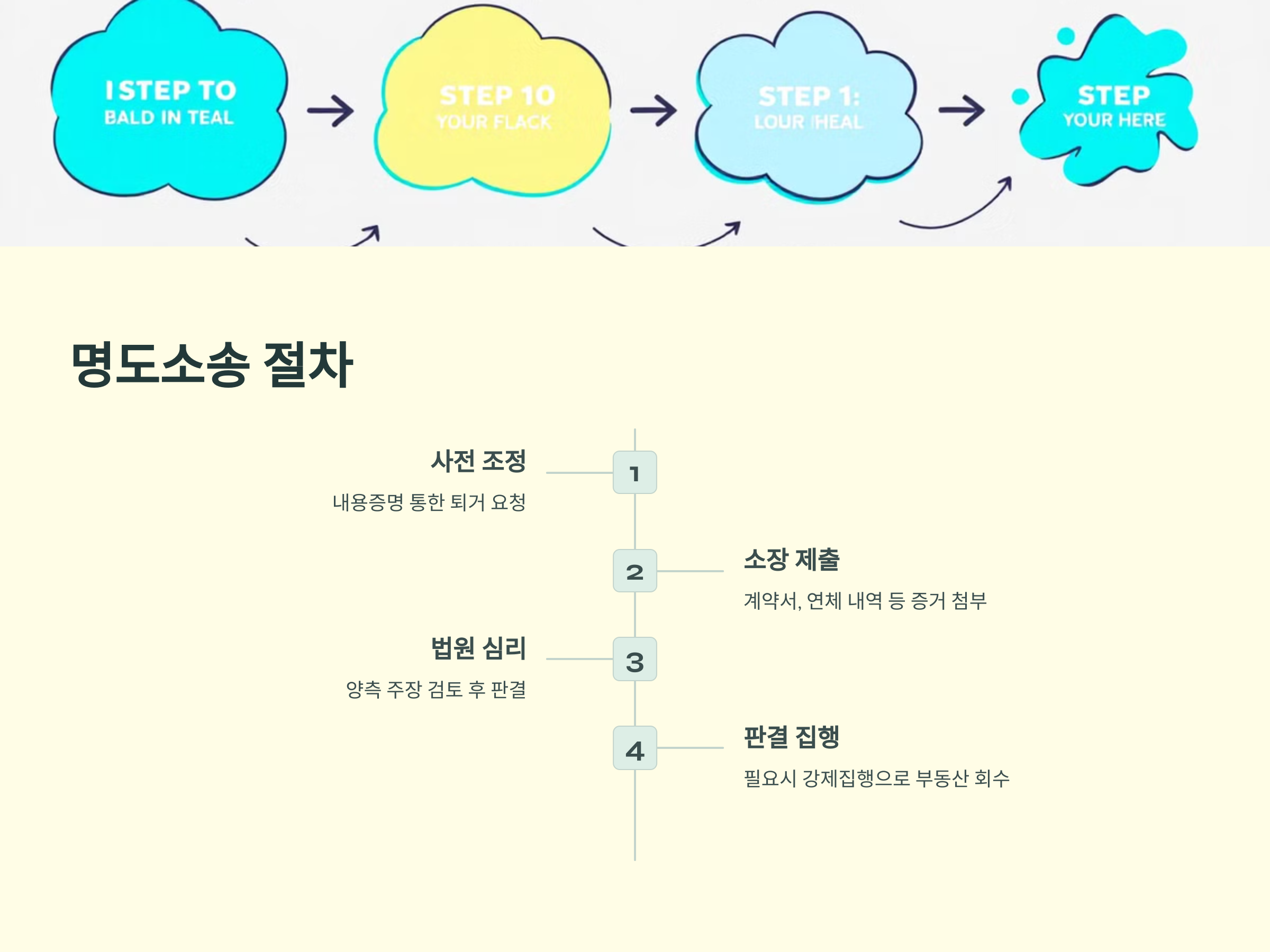 명도소송은 다음과 같은 절차로 진행됩니다: