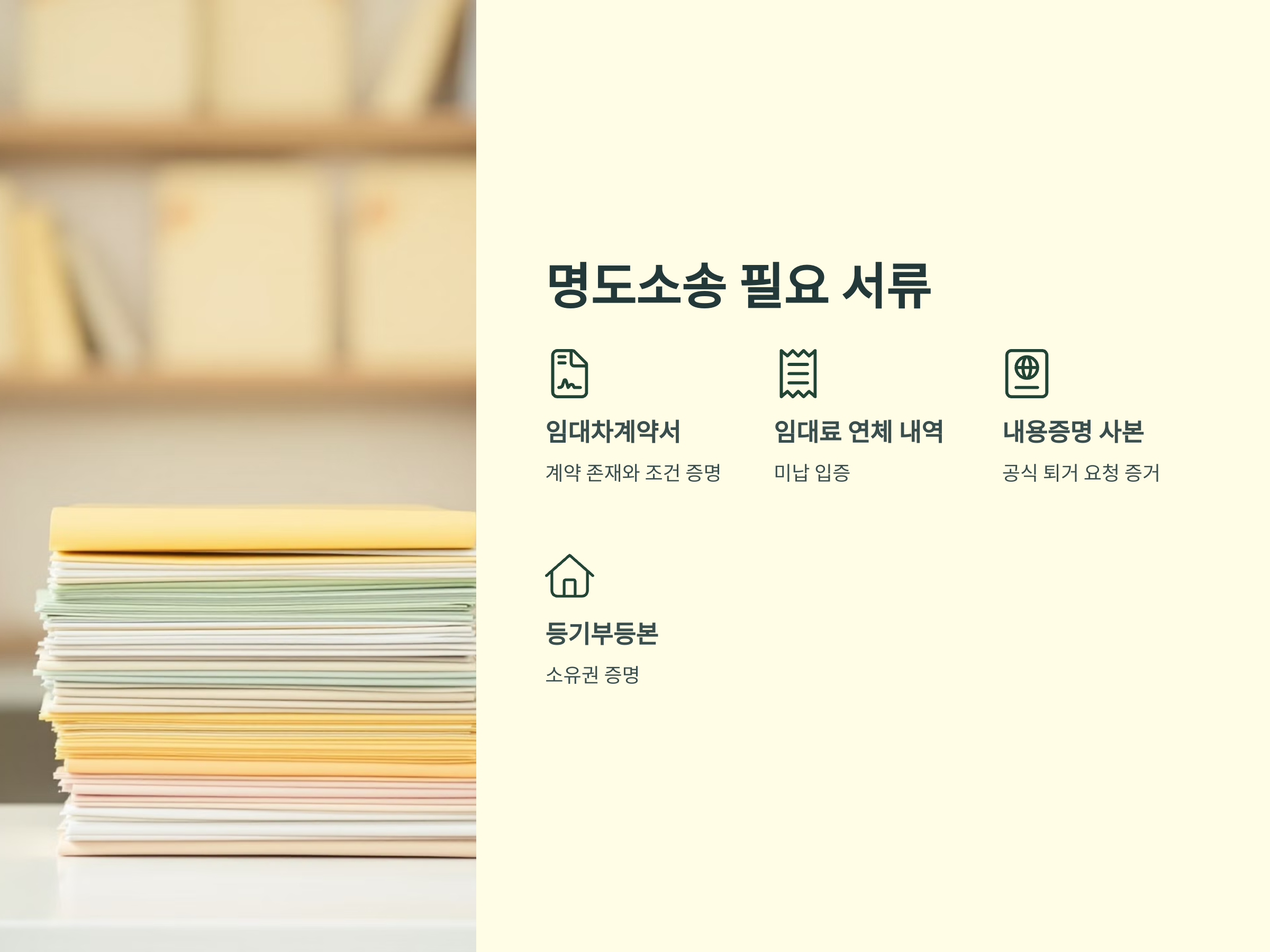 명도소송을 진행하기 위해서는 다음과 같은 서류가 필요합니다: