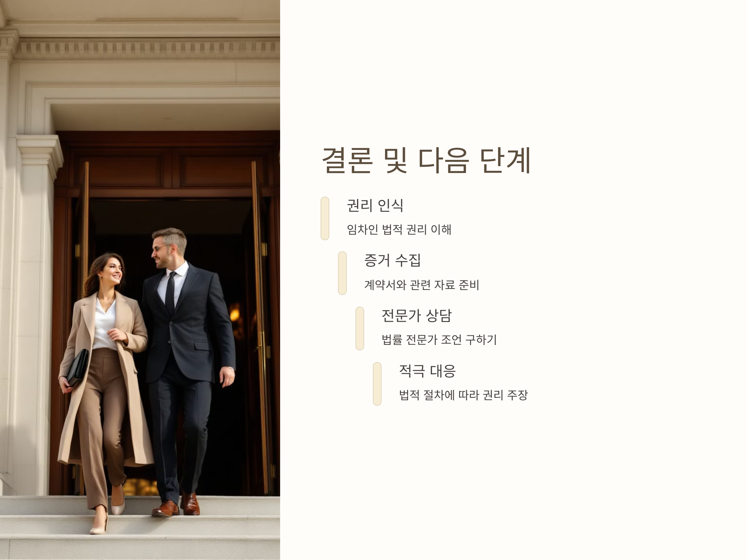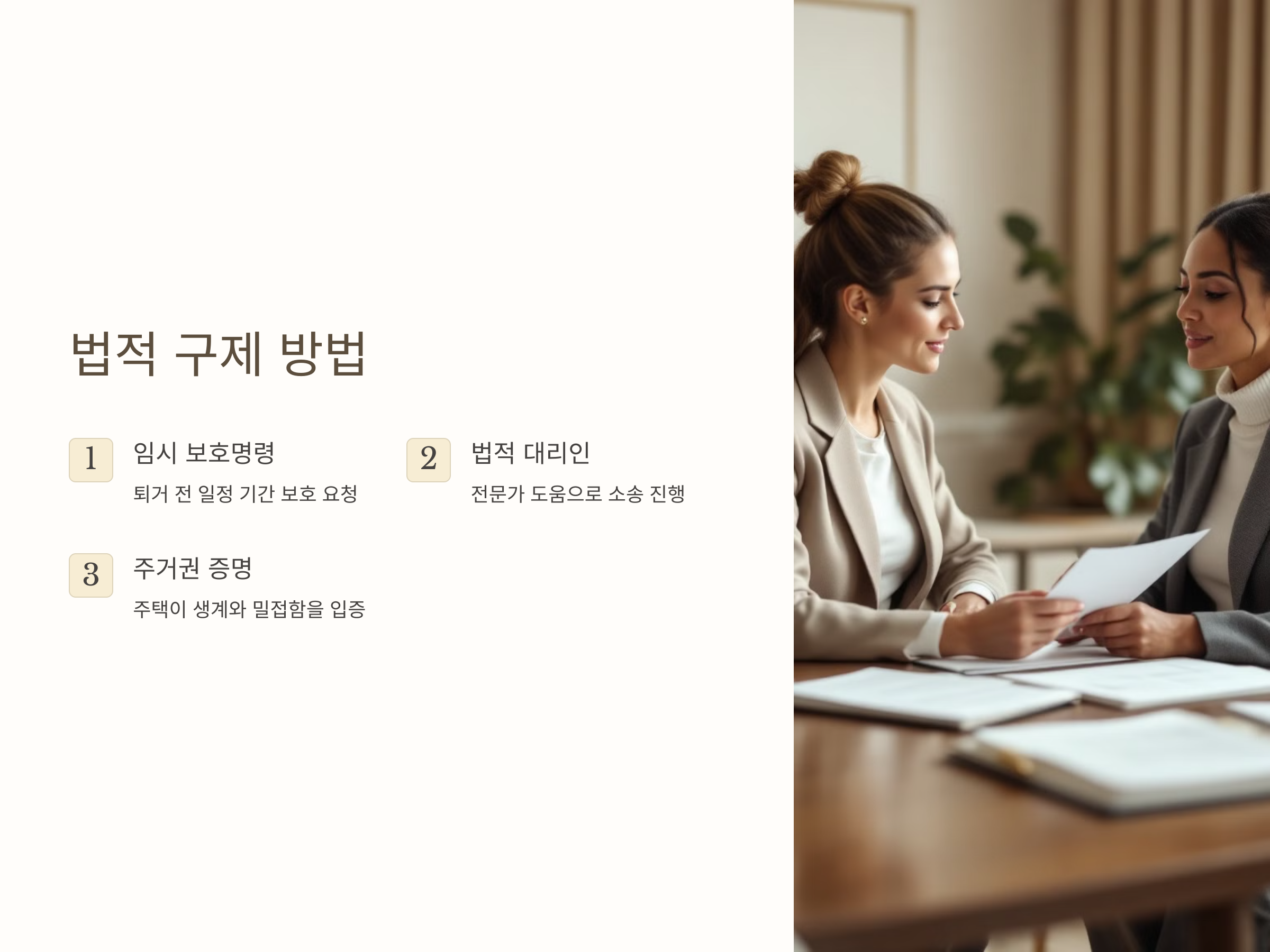 특히, 임차인은 법적 대응을 준비하면서 자신의 권리가 침해되지 않도록 주의해야 하며, 급하게 퇴거 요구를 받을 경우에는 법원에 임시 보호명령을 요청하는 등의 방법을 활용할 수 있습니다. 임차인의 권리를 보호하기 위한 법적 방법은 점차 확대되고 있으며, 이를 통해 임차인이 불이익을 당하지 않도록 할 수 있습니다.