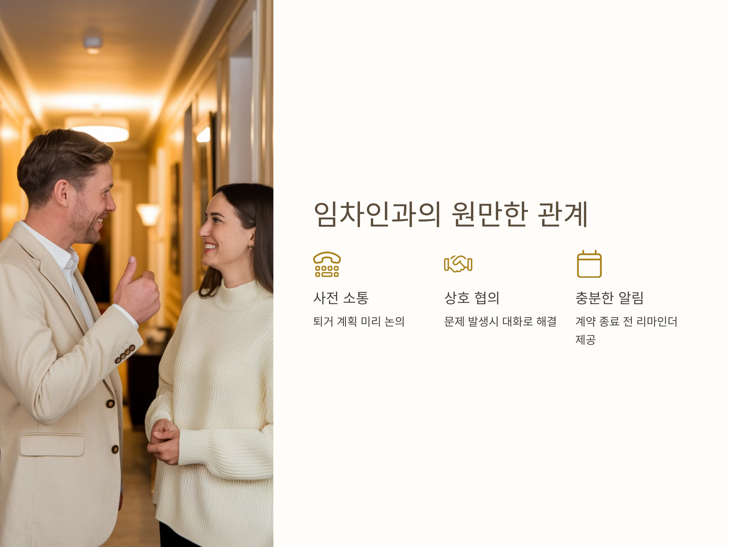 원만한 관계를 유지하면, 임차인이 자발적으로 퇴거하는 경우가 많습니다. 법적 소송 없이 자연스럽게 문제를 해결할 수 있기 때문에, 소송을 피할 수 있는 확률이 높아집니다. 또한, 임차인과의 관계가 원만할 경우, 임대인은 임차인이 퇴거하지 않을 때 대화를 통해 문제를 해결하는 데 유리한 위치를 차지하게 됩니다.