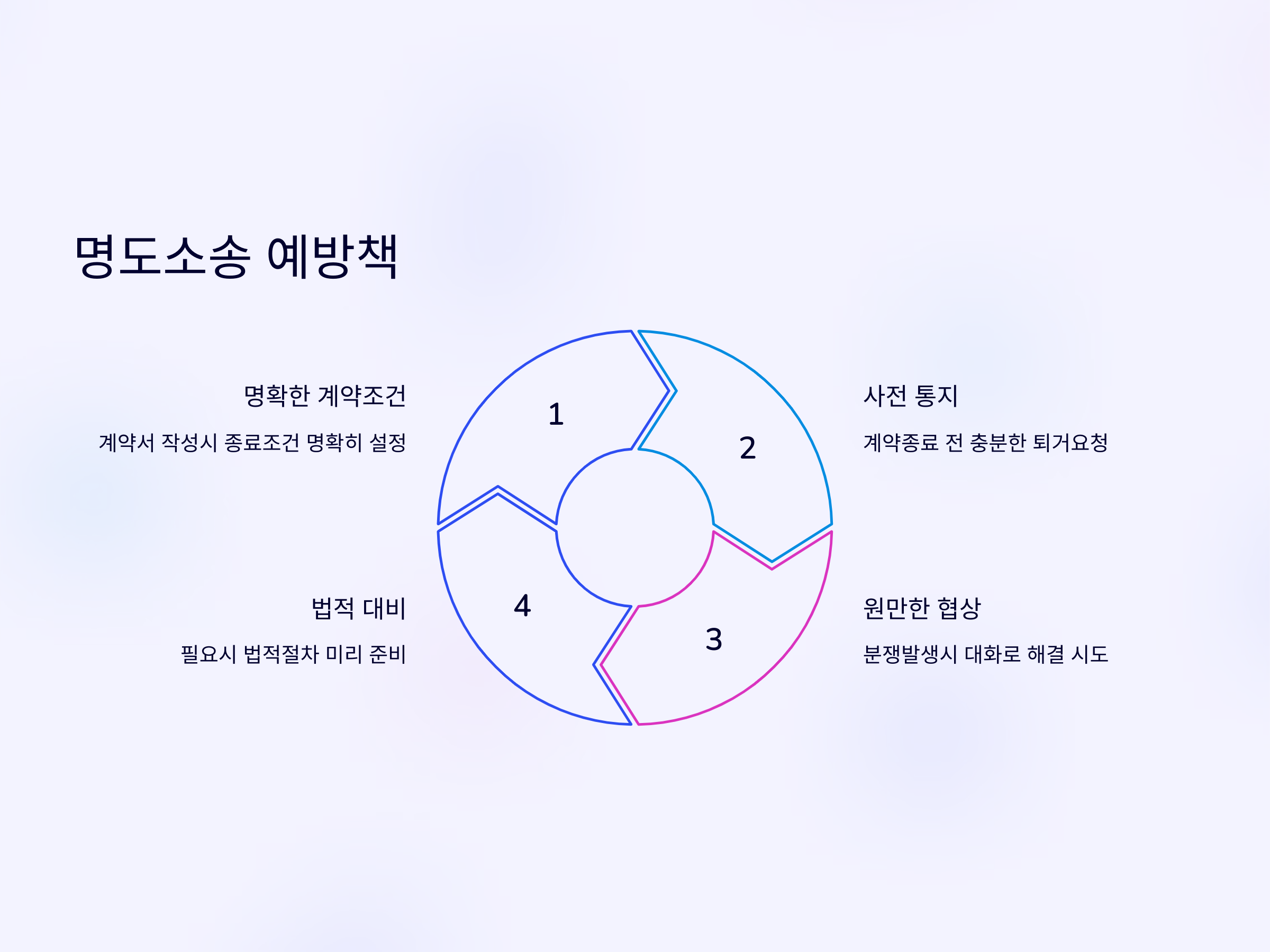 명도소송은 임대인과 임차인 간의 갈등을 해결하기 위한 법적 절차지만, 예방하는 것이 가장 이상적입니다. 명도소송을 피하기 위해서는 계약서 작성 시 명확한 조건을 설정하고, 계약 종료 전 임차인에게 충분히 퇴거 요청을 하는 것이 중요합니다. 또한, 임차인이 계약을 이행하지 않거나 퇴거를 거부할 경우, 미리 법적 절차를 준비하는 것이 좋습니다.