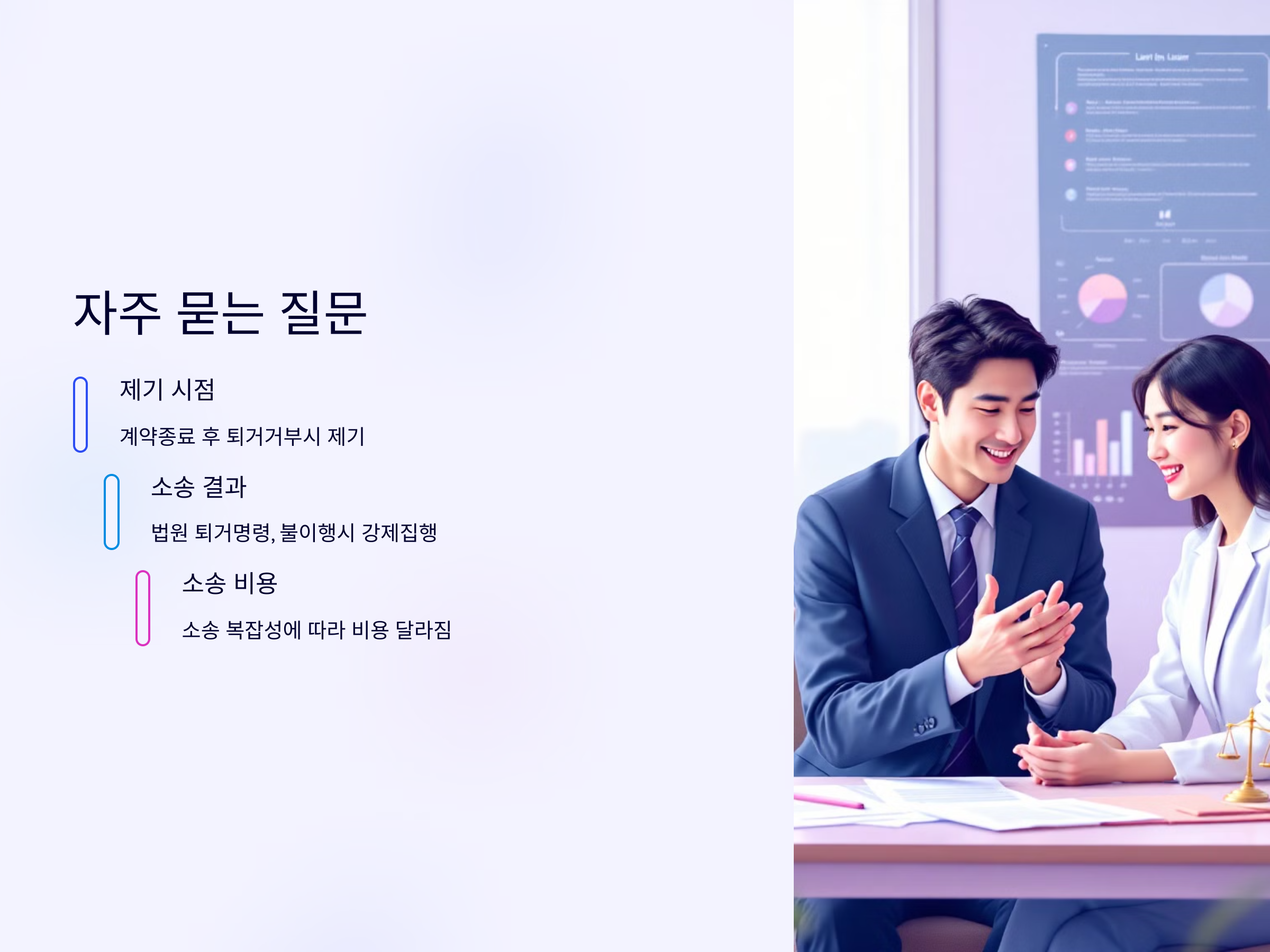명도소송은 임대차계약 종료 후 발생할 수 있는 분쟁을 해결하는 중요한 법적 절차입니다. 임대인은 명도소송을 통해 부동산을 반환받을 수 있으며, 이 과정에서 중요한 점은 명확한 서류와 법적 절차를 준수하는 것입니다. 명도소송을 진행하기 전에 충분한 준비를 하고, 법적 조언을 받는 것이 중요합니다.