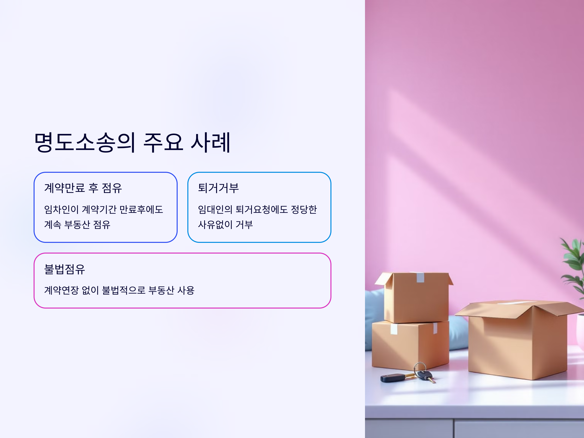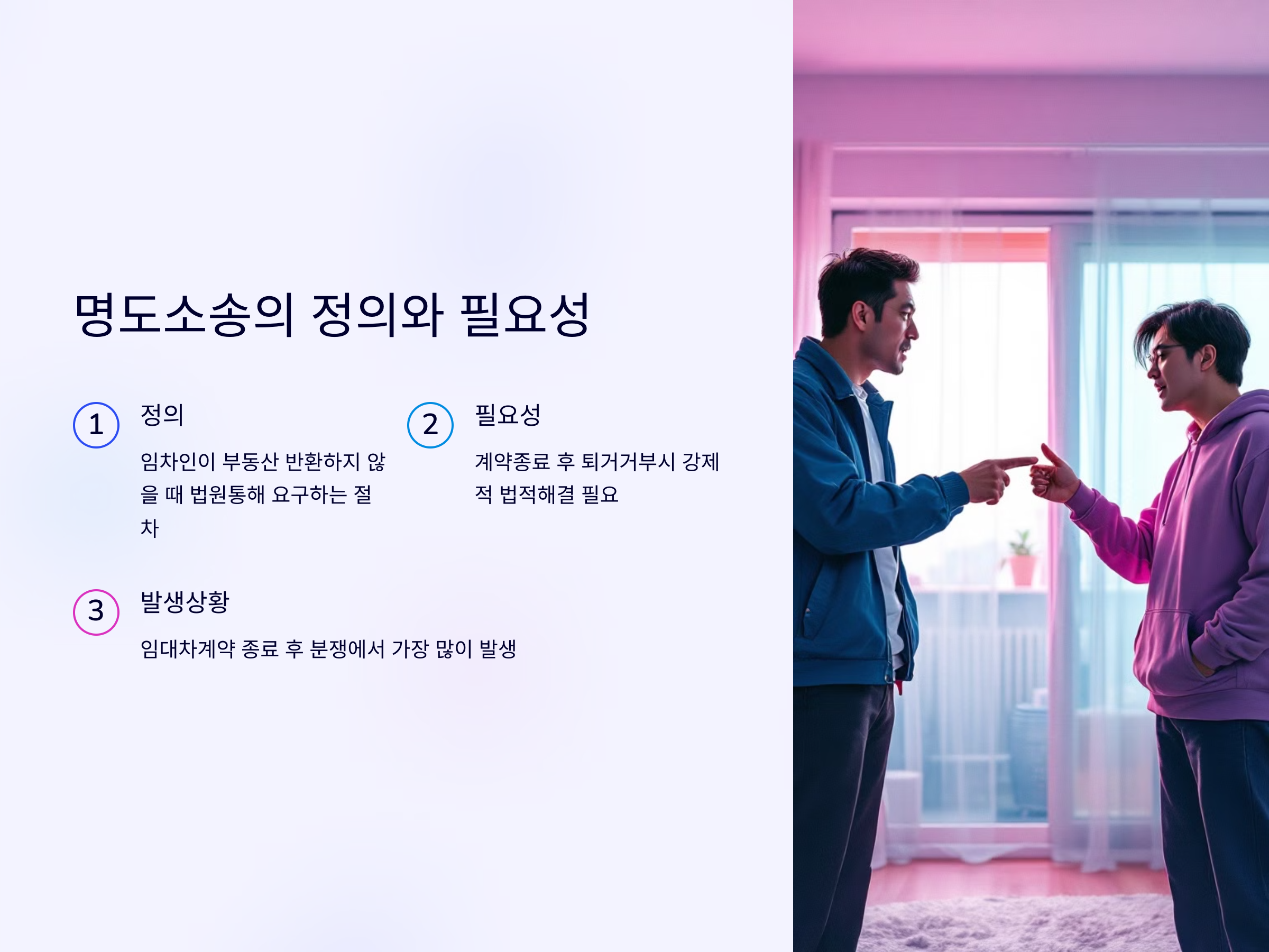 명도소송은 임대인이 계약 기간 만료 후에도 퇴거하지 않는 임차인에게 부동산을 반환받기 위한 강제적인 법적 절차입니다. 이 소송은 단순한 퇴거 요구를 넘어서, 임차인이 계약을 위반하고 부동산을 점유하고 있는 상태를 법적으로 해결하는 데 필요합니다. 명도소송은 일반적으로 임대차 계약이 종료된 후 발생하는 분쟁에서 가장 많이 발생합니다.