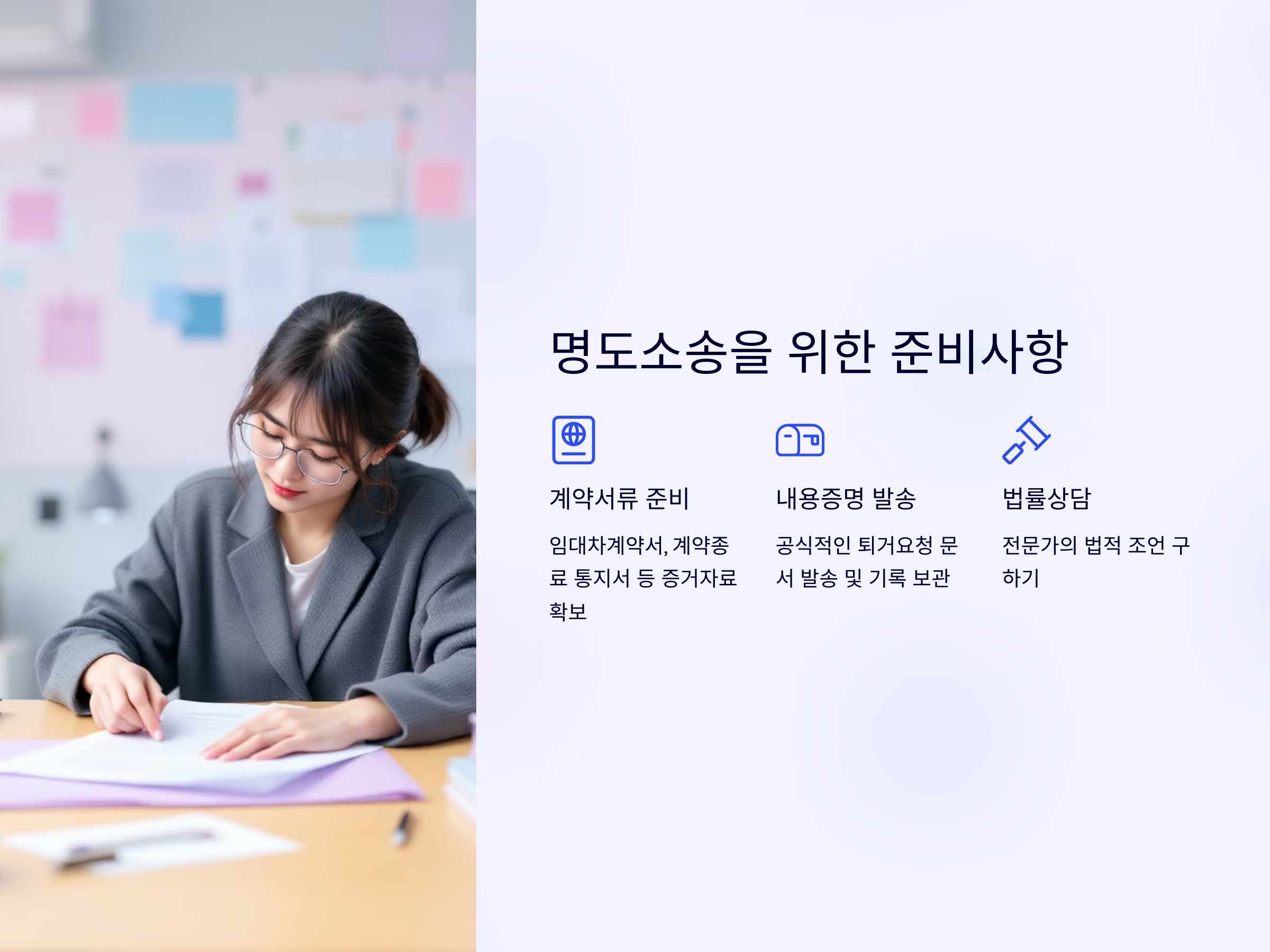 명도소송을 진행하기 위해서는 몇 가지 준비가 필요합니다. 첫째, 임대인은 임차인에게 퇴거를 요청하는 공식적인 서류를 보내야 합니다. 일반적으로 내용증명을 통해 임차인에게 퇴거를 요구하는 것이 가장 일반적인 방법입니다. 이때, 임차인이 퇴거를 거부하거나 반응하지 않으면, 임대인은 법원에 명도소송을 제기해야 합니다.