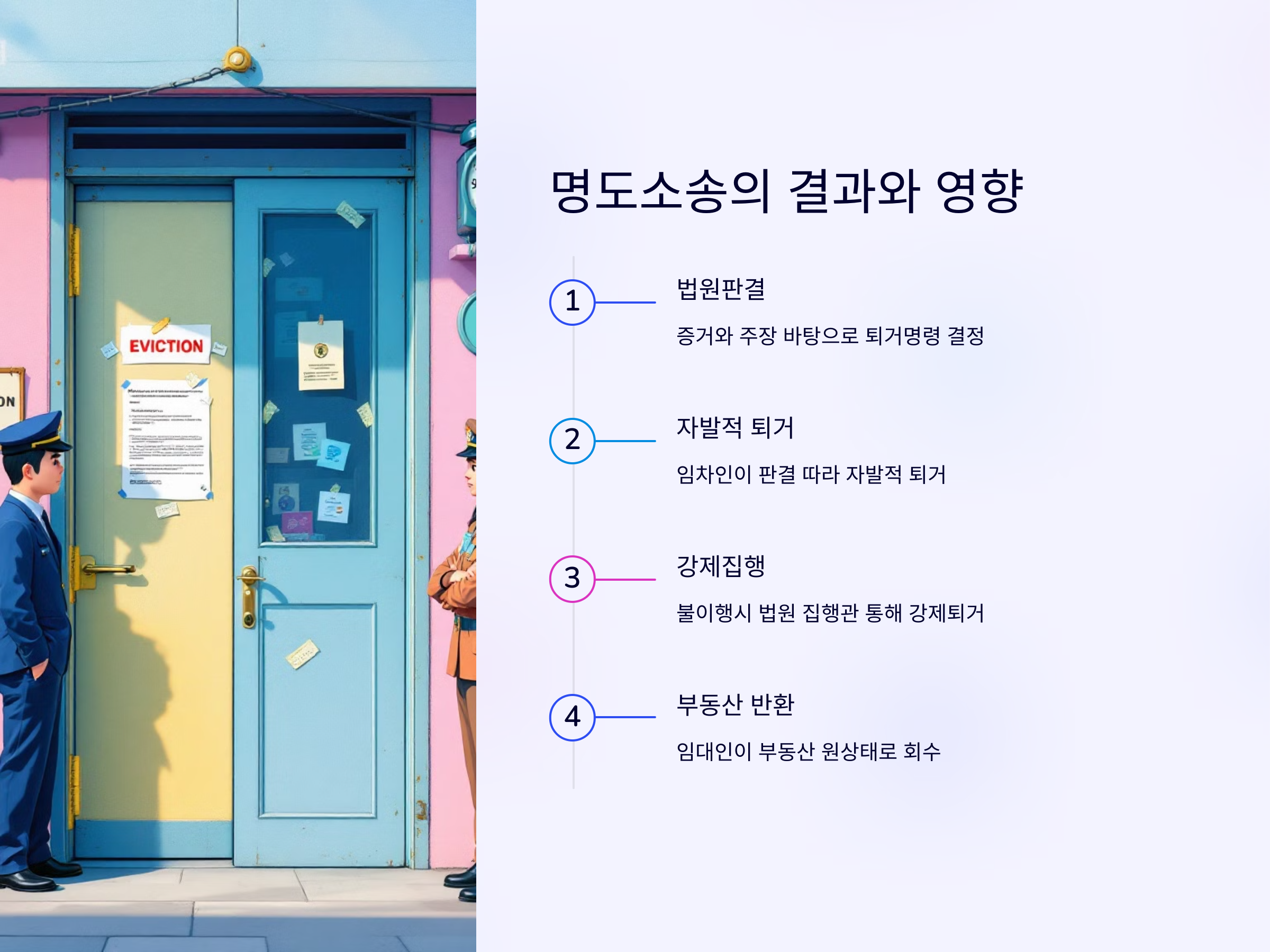 명도소송에서 법원이 퇴거 명령을 내리면, 임차인은 이를 따라야 하며, 이를 이행하지 않으면 강제 집행을 통해 부동산을 반환받을 수 있습니다.