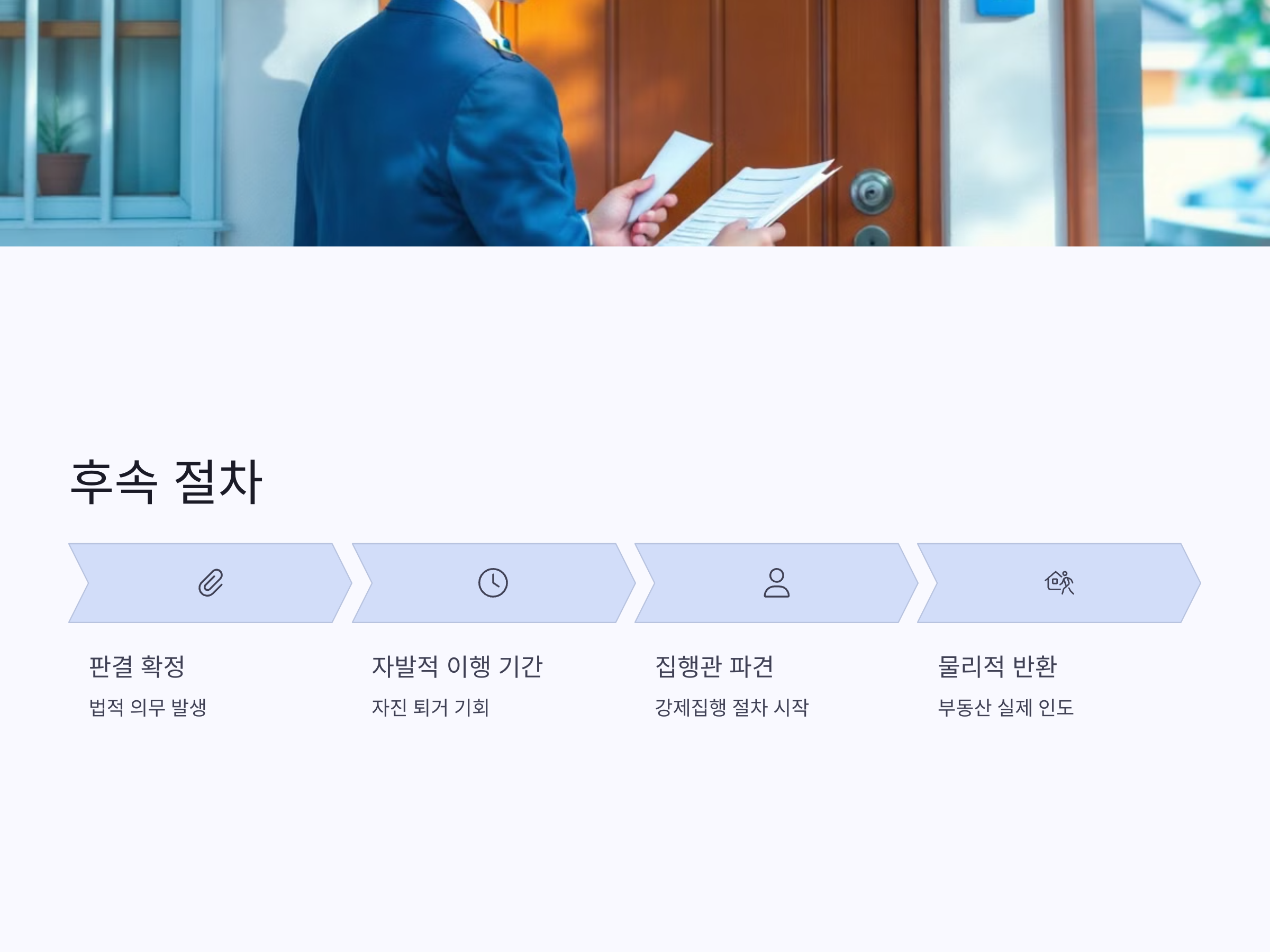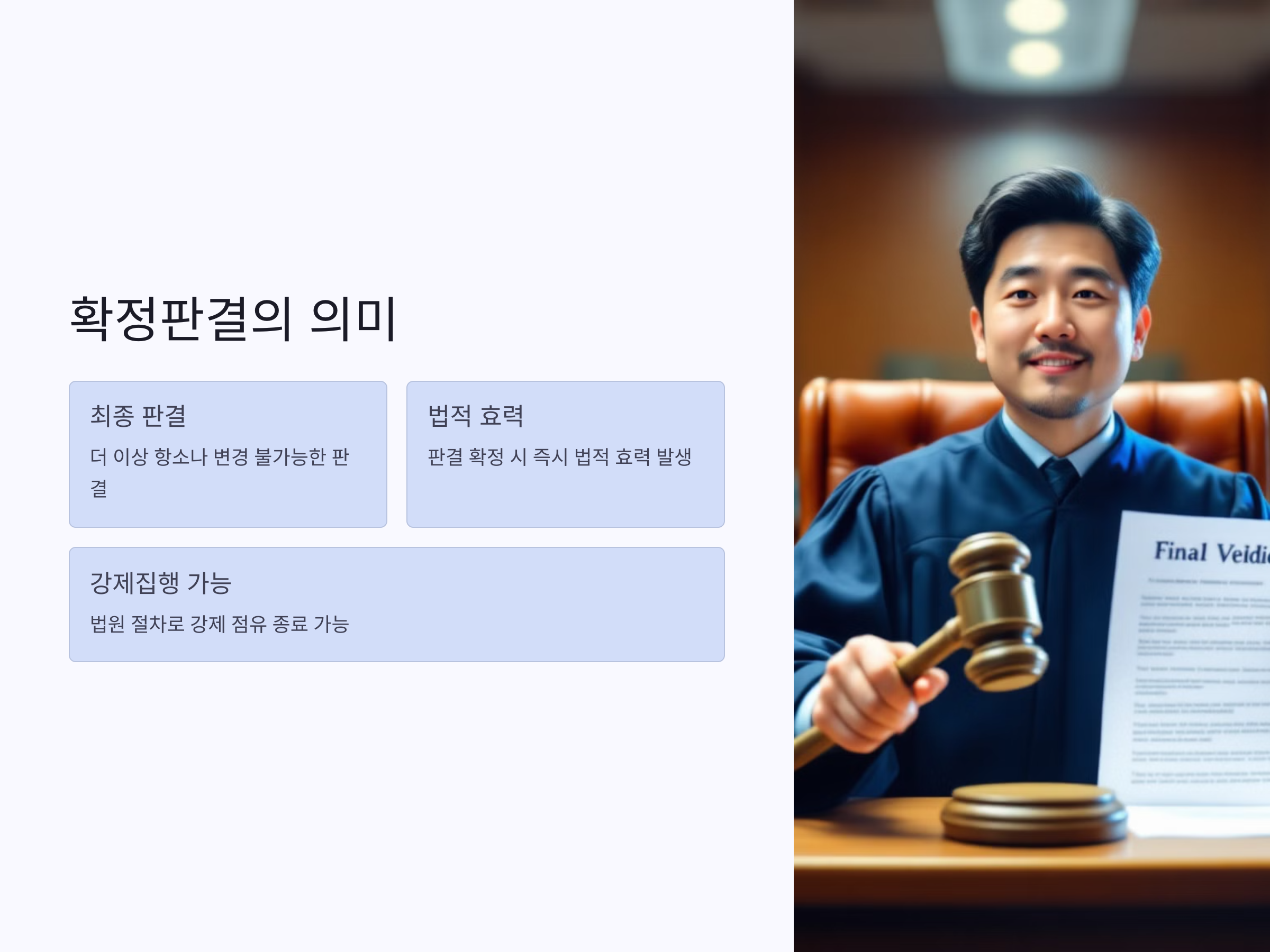 확정판결이 내려지면, 판결을 받은 사람은 법적 절차를 통해 해당 부동산을 실제로 반환받을 수 있게 됩니다. 이때, 법원의 강제집행 절차가 진행되기도 하며, 이를 통해 강제로 점유를 종료하고 부동산을 반환받을 수 있습니다.