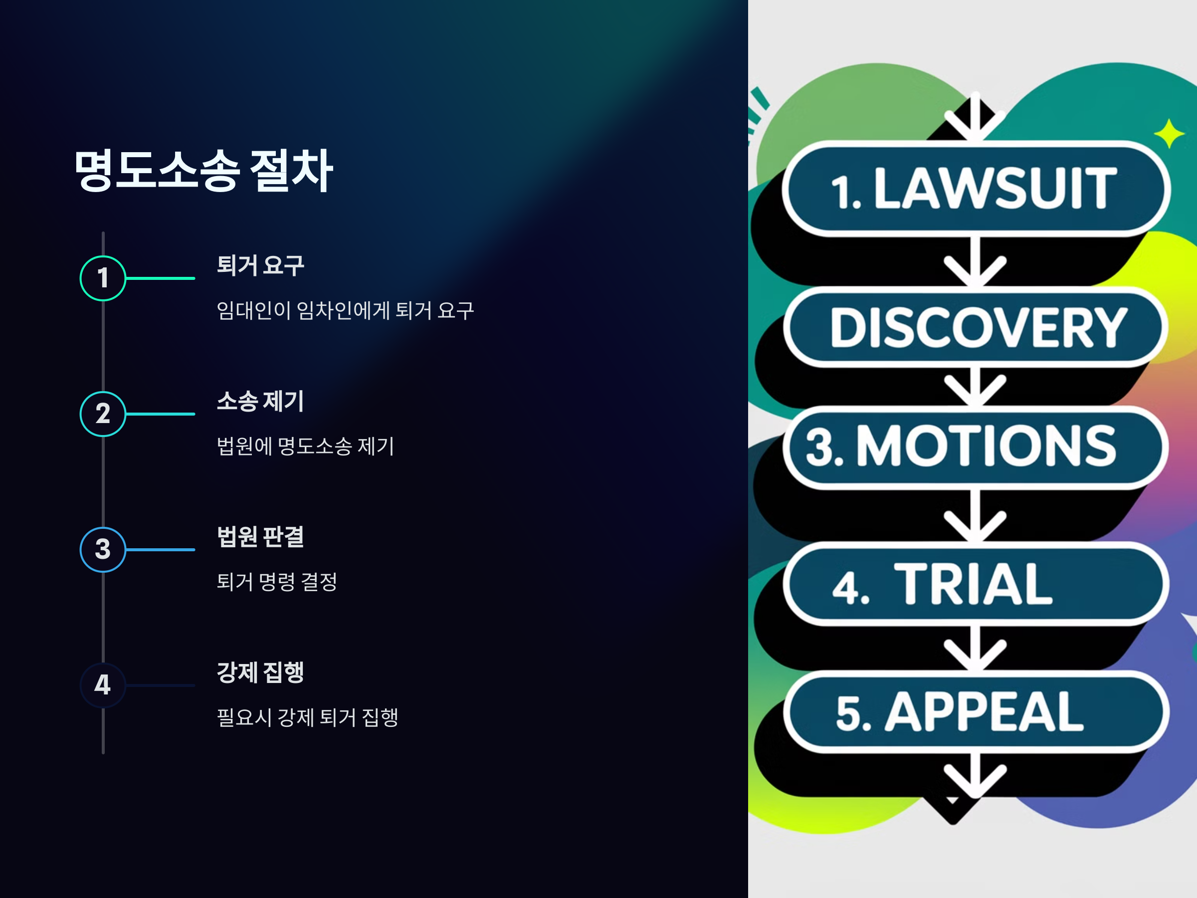 - 소송 제기: 임차인이 퇴거를 거부할 경우, 임대인은 법원에 명도소송을 제기할 수 있습니다. 소송은 민사소송법에 따라 진행되며, 임대인은 퇴거를 요구하는 소장을 제출해야 합니다.