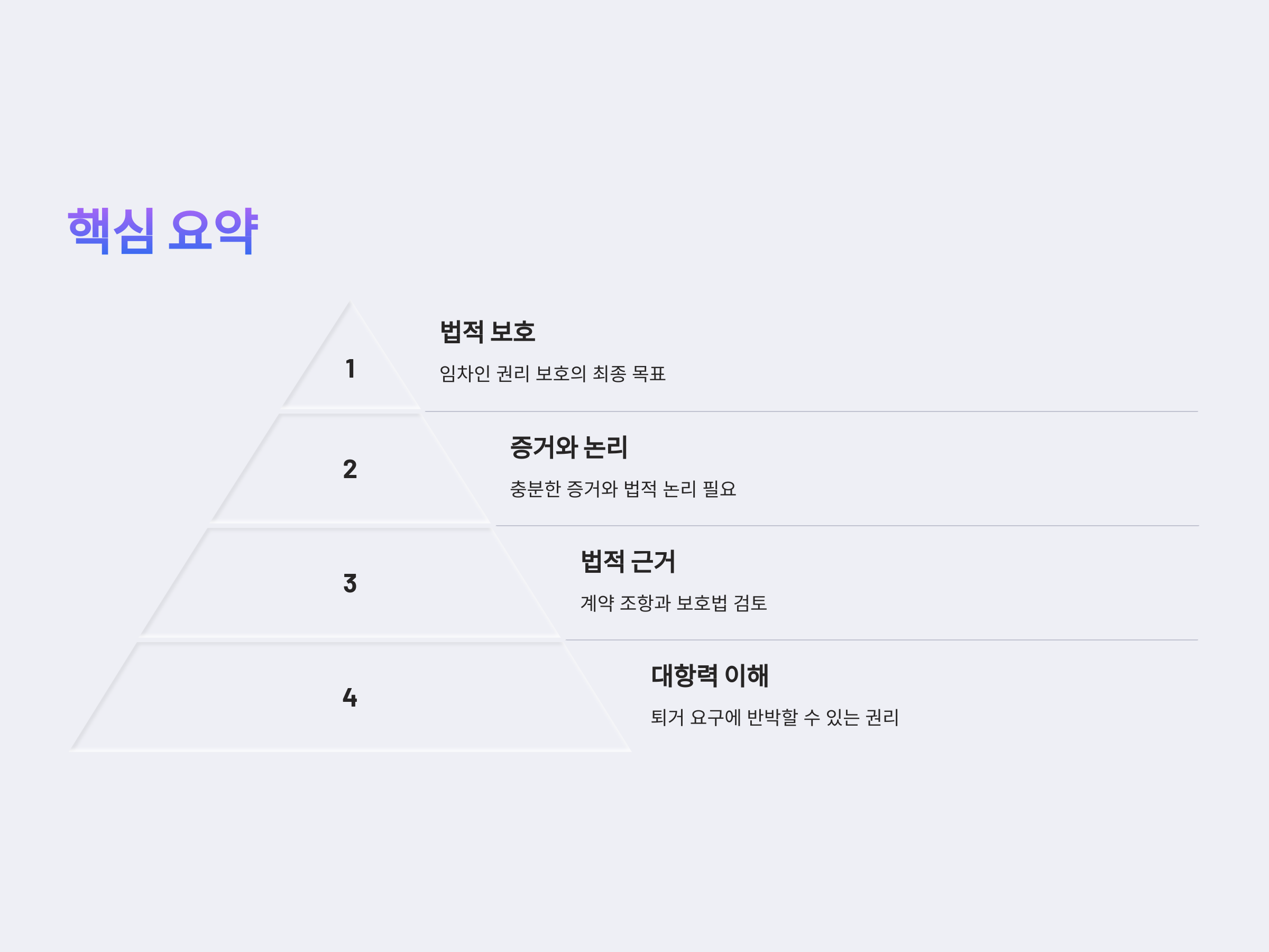 임차인이 대항력을 주장하는 과정에서 중요한 점은 자신의 권리를 충분히 입증할 수 있는 증거를 확보하는 것입니다. 예를 들어, 계약서, 임대인의 퇴거 요구서, 세입자 보호 관련 문서 등을 준비하여 법정에서 자신의 주장을 뒷받침할 수 있어야 합니다. 이와 같은 증거를 통해 임차인은 법원에서 자신을 보호할 수 있는 법적 권리를 주장할 수 있습니다.