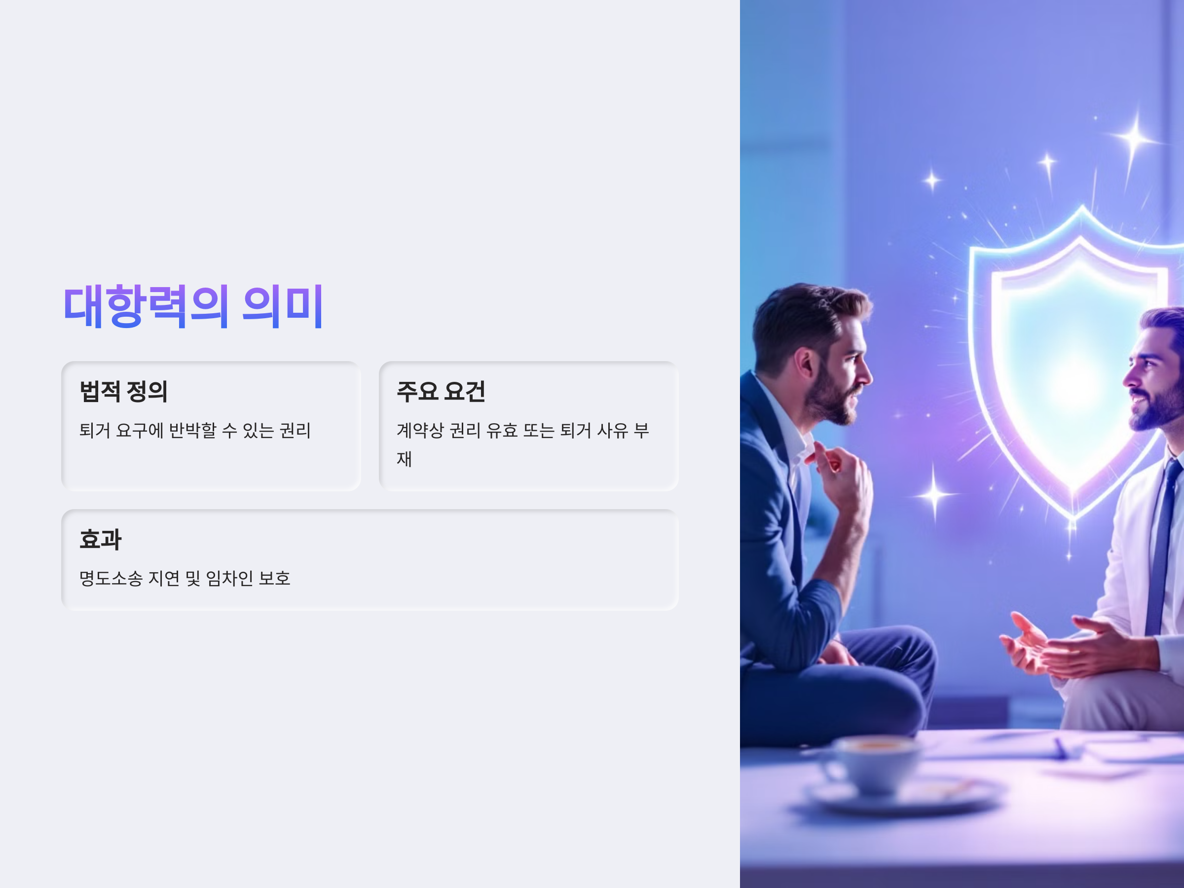 대항력은 임차인이 명도소송에 대해 법적으로 반박할 수 있는 권리를 의미합니다. 즉, 임차인이 퇴거를 요구받을 때, 임차인은 법적인 이유를 들어 퇴거를 거부할 수 있는 권리를 가질 수 있습니다. 대항력의 주요 요건은 임차인의 계약상 권리가 여전히 유효하다는 점, 또는 임차인이 퇴거해야 할 법적 사유가 없다는 점입니다.