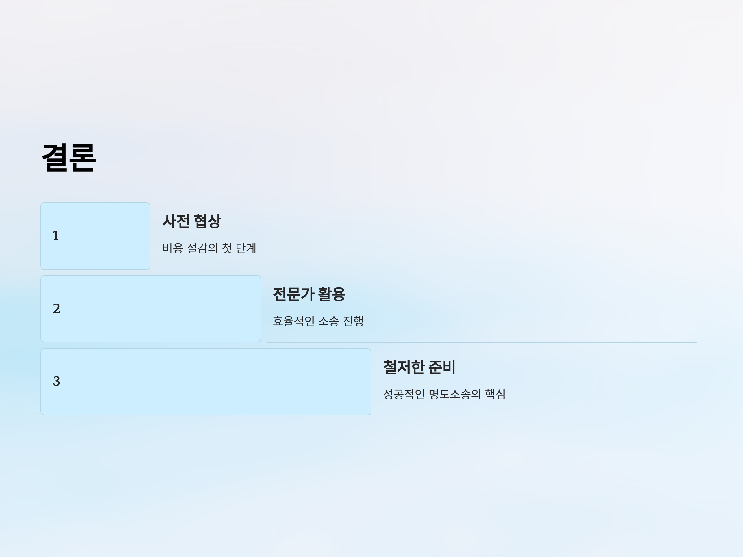명도소송은 임대인의 권리를 보호하기 위한 중요한 절차이지만, 비용과 시간이 많이 소요될 수 있습니다. 사전 협상, 무료 법률 지원 활용, 전문 변호사 선임 등을 통해 비용을 효율적으로 관리하고, 철저한 준비를 통해 소송을 진행하는 것이 바람직합니다.