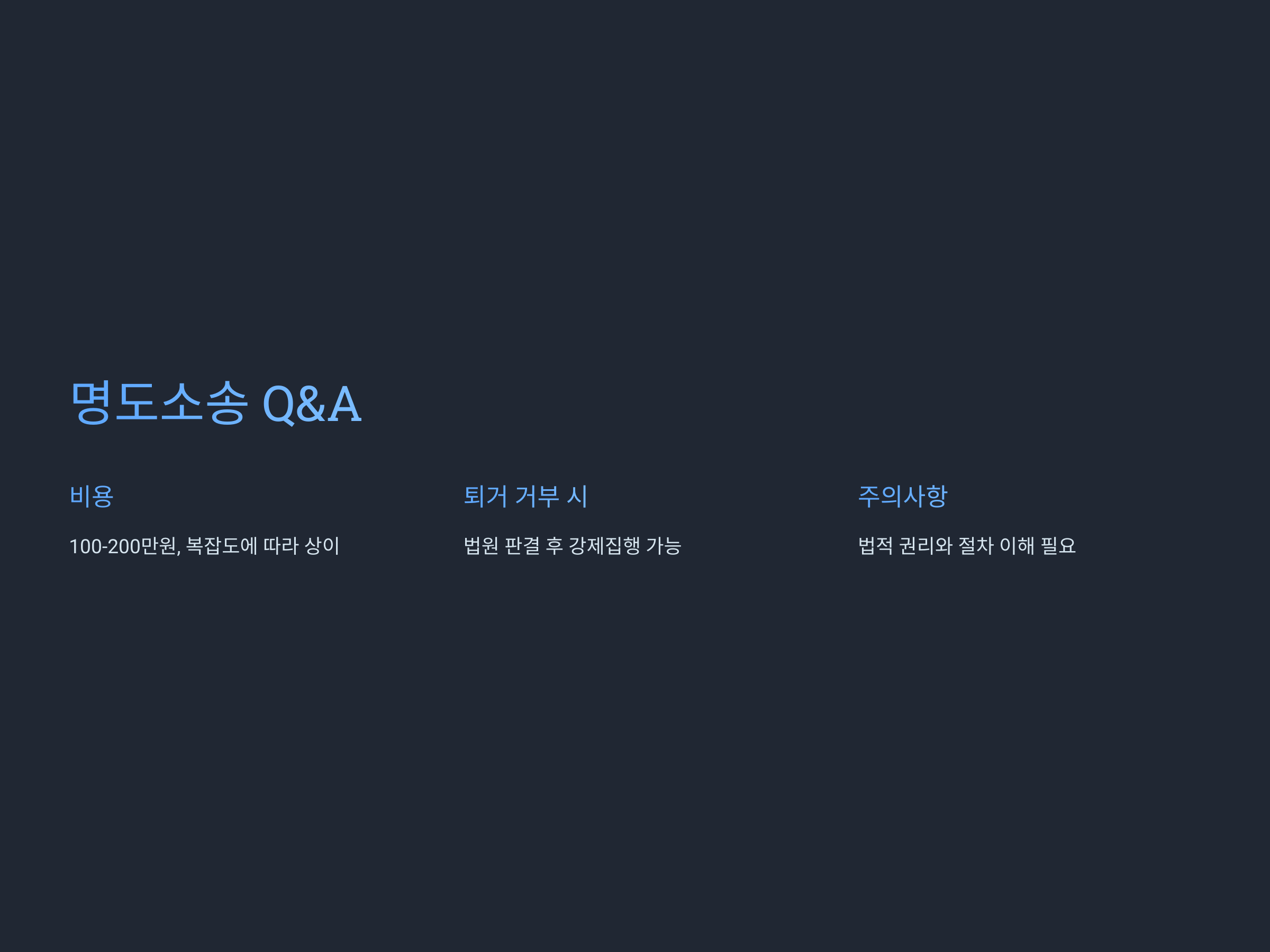 명도소송은 시간이 오래 걸릴 수 있지만, 철저한 준비와 법적인 절차를 준수하면 성공적인 결과를 얻을 수 있습니다. 위에서 소개한 사례처럼, 소송을 준비하면서 충분한 증거를 확보하고, 법적 절차를 정확히 따르는 것이 중요합니다.