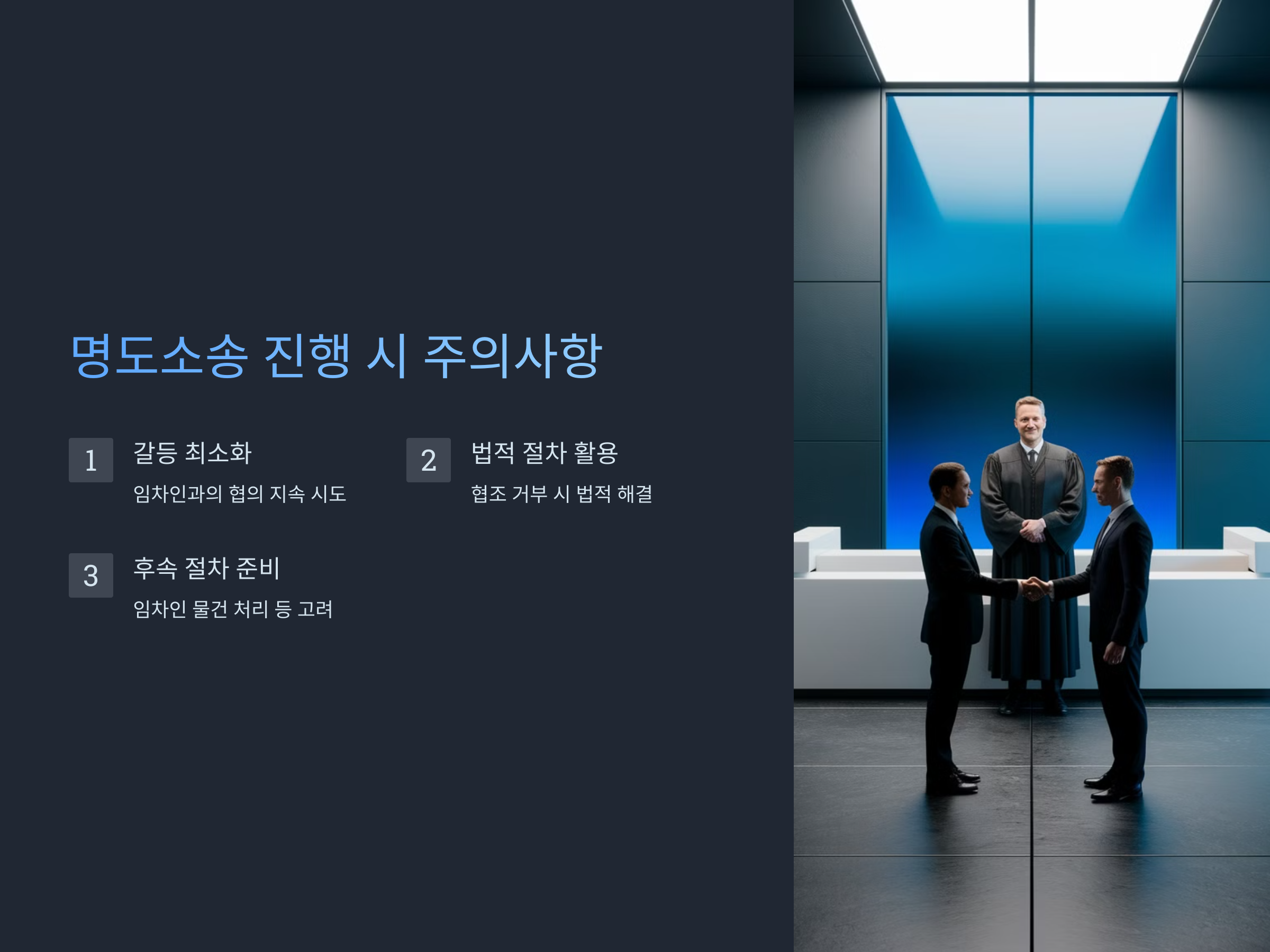 명도소송을 진행하는 분들은 법적인 권리와 절차를 잘 이해하고, 상황에 맞는 최선의 방법을 선택하는 것이 필요합니다.
