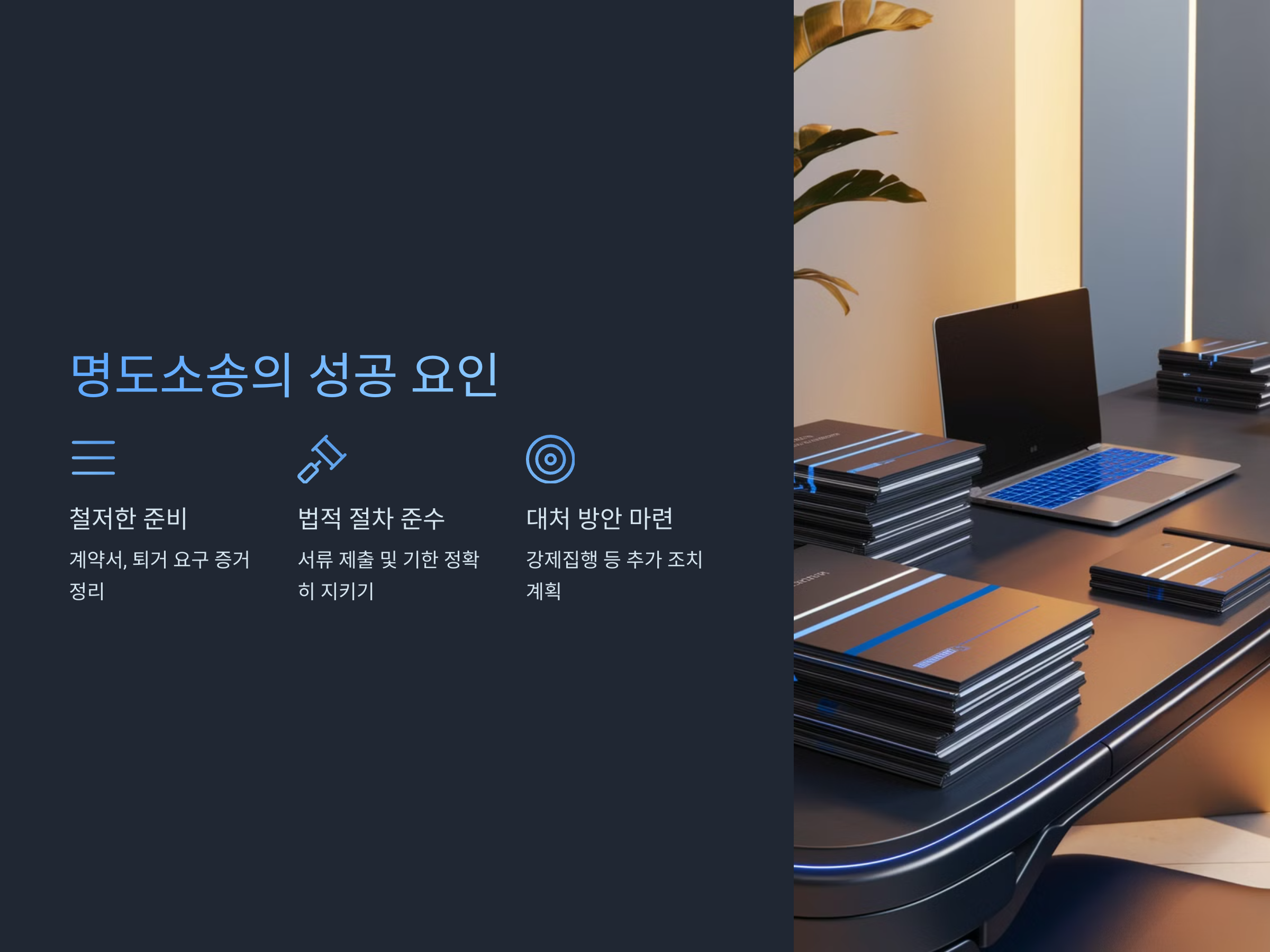 명도소송에서 성공을 거두기 위해서는 몇 가지 중요한 요소들이 있습니다.