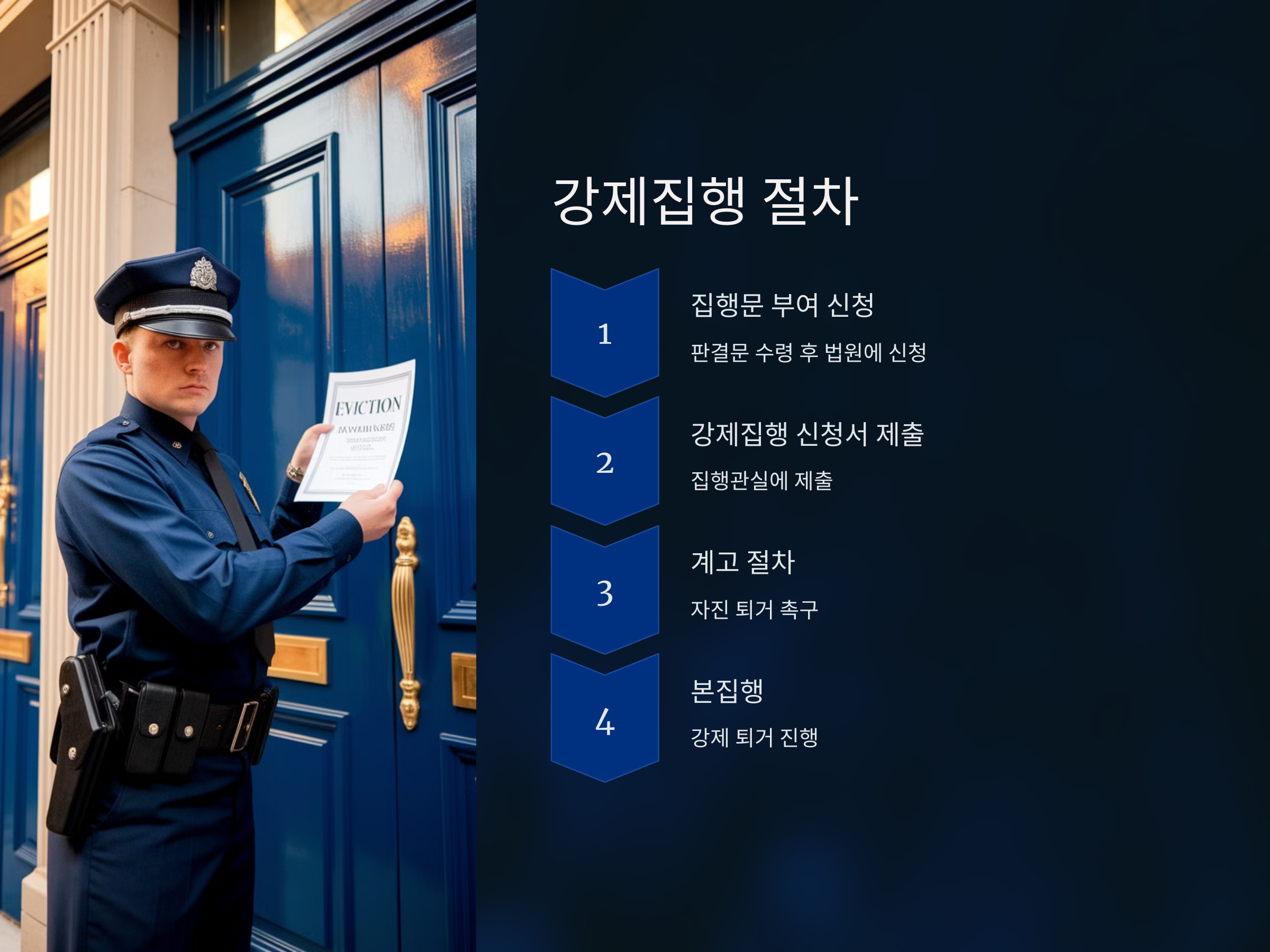 - 본집행: 계고 기간 내에 퇴거하지 않으면, 집행관이 강제적으로 점유자를 퇴거시키는 본집행을 진행합니다.