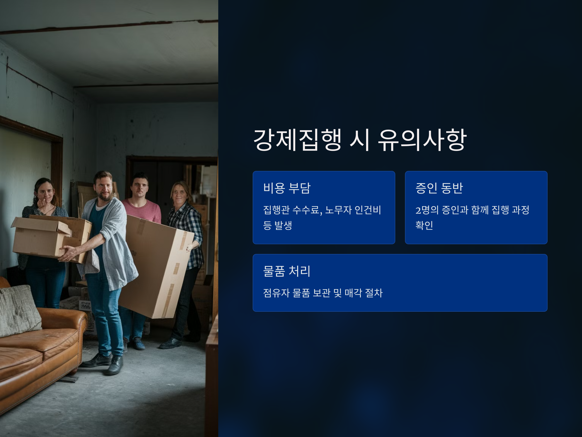 - 비용 부담: 강제집행에는 집행관 수수료, 노무자 인건비, 보관비용 등이 발생합니다. 초기에는 소유자가 부담하지만, 추후 점유자에게 청구할 수 있습니다.