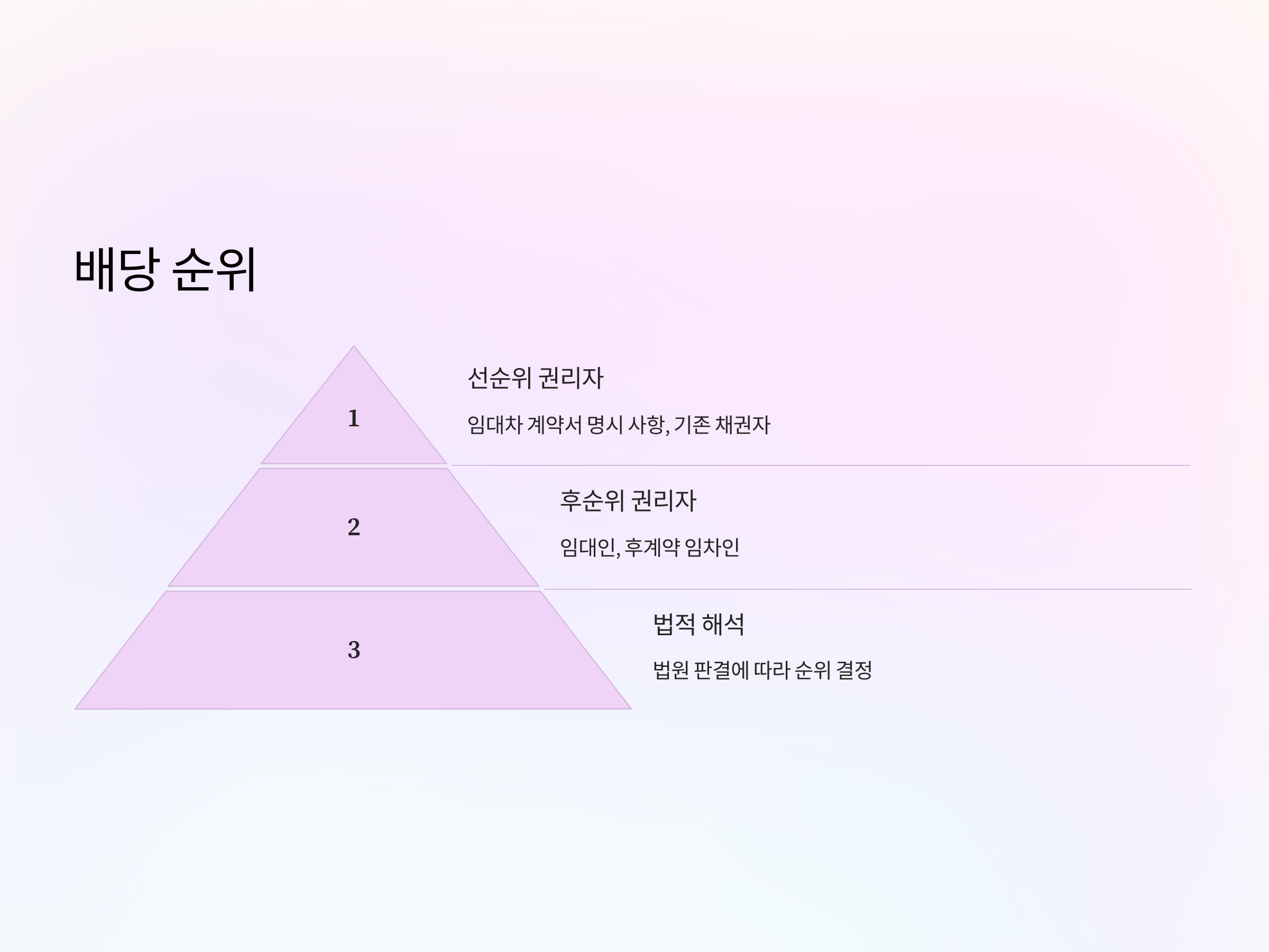 - 선순위 권리자: 가장 우선적으로 배당을 받는 사람들은 선순위 권리자입니다. 이들은 보통 임대차 계약서에 명시된 사항이나 이전에 존재한 법적 채권자들입니다.