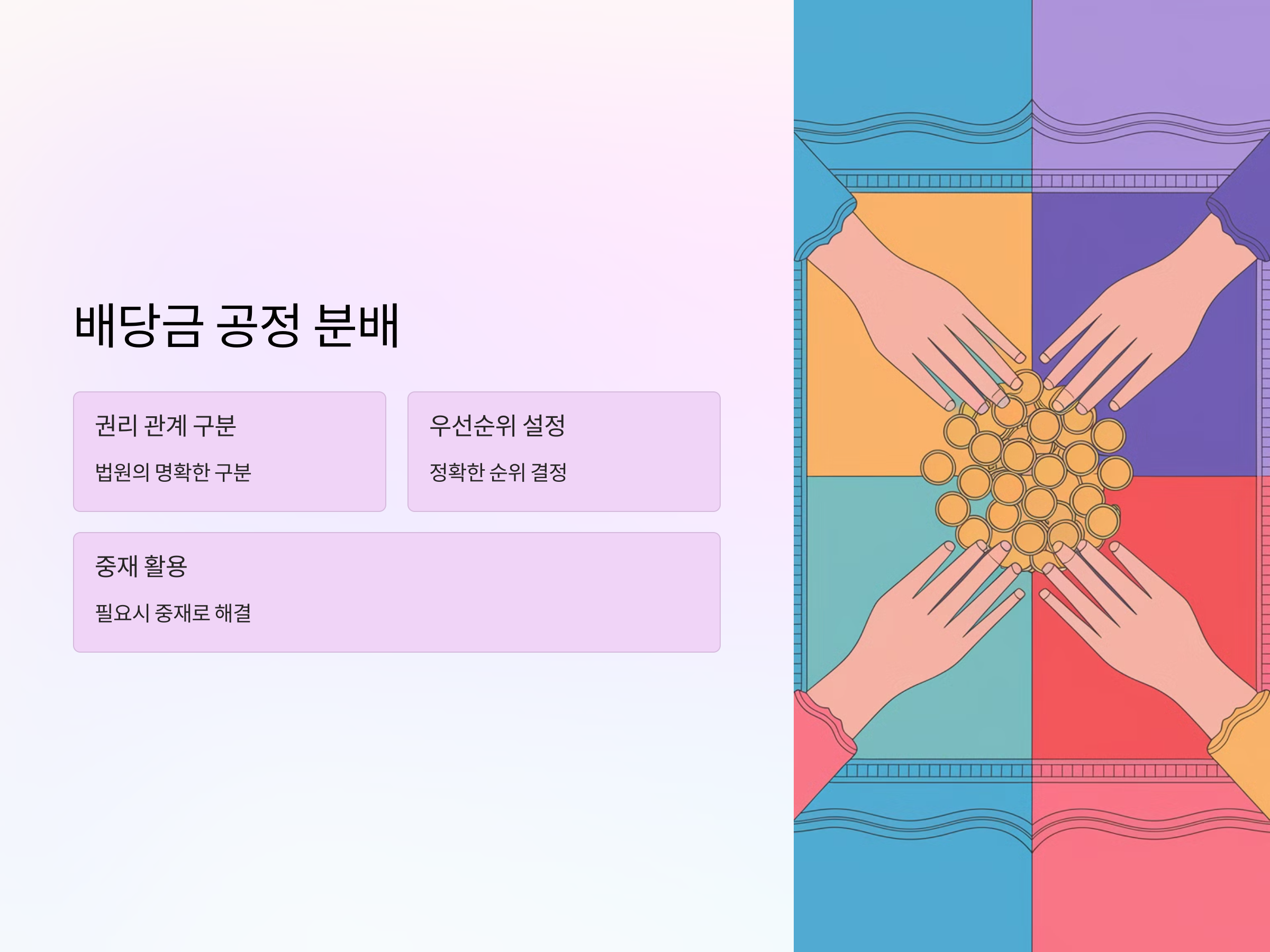 배당금을 공정하게 분배하는 방법은 법원에서 권리 관계를 명확히 구분하고, 우선순위를 정확히 설정하는 것입니다. 또한, 각자의 법적 권리가 충돌하지 않도록 조정하며, 필요한 경우 중재를 통해 문제를 해결할 수 있습니다.