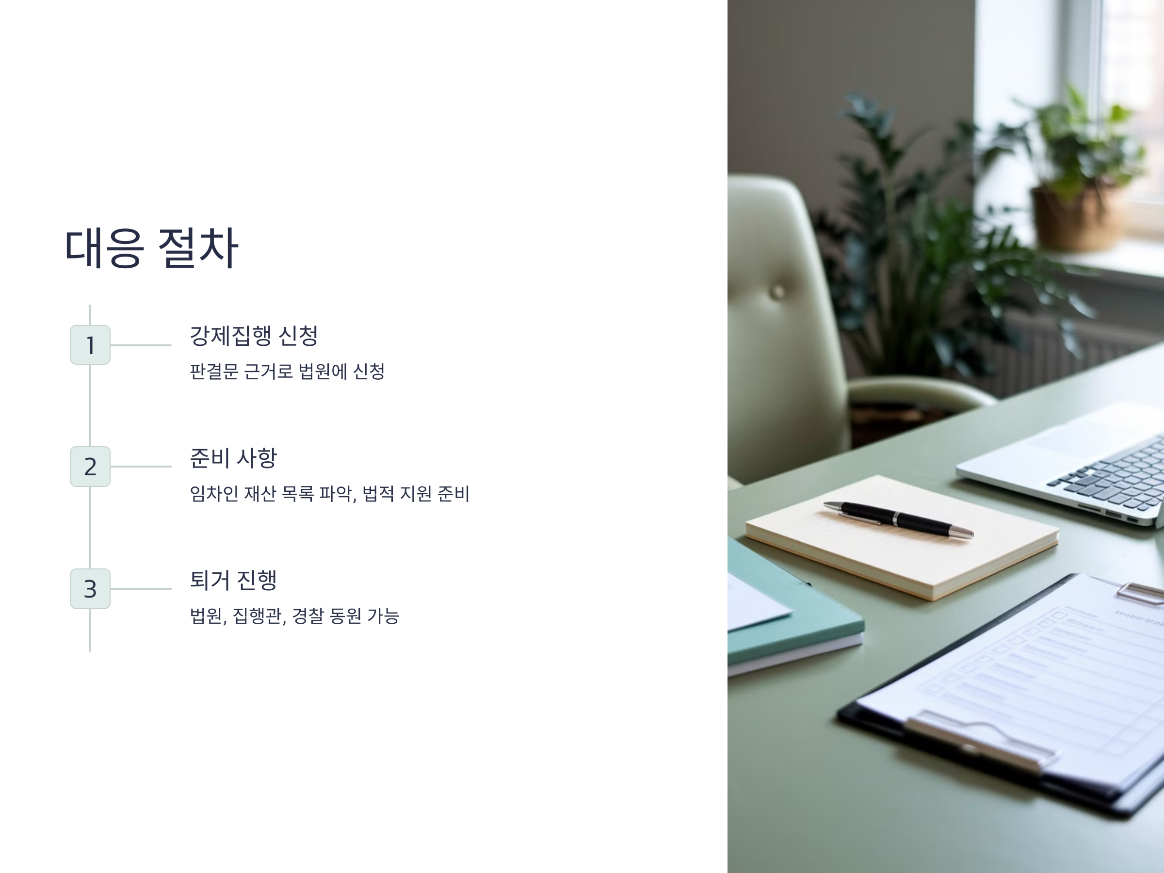 - 강제집행을 진행하기 전에, 반드시 임차인의 재산 목록을 파악하고, 퇴거가 불가능한 상황에서 발생할 수 있는 문제를 미리 예측해야 합니다.