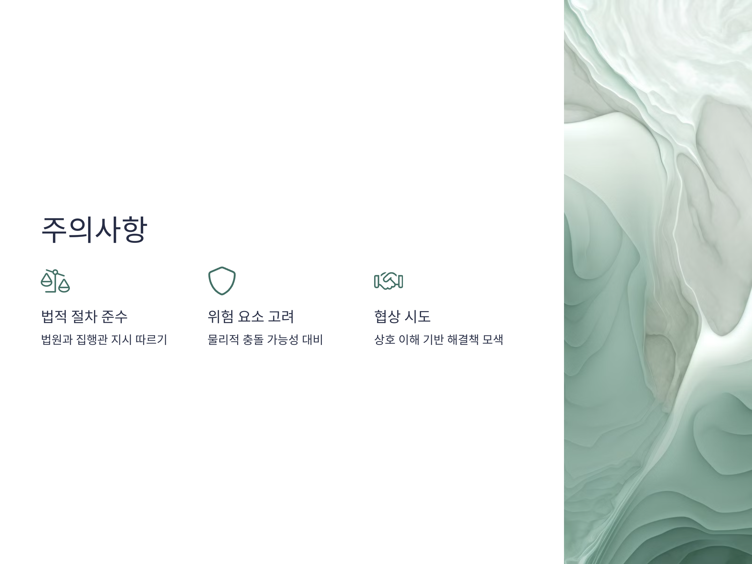 - 임차인이 거주지를 떠나지 않을 경우, 물리적인 충돌이 발생할 수 있으므로 이를 미리 예측하고 대응 방안을 마련하는 것이 중요합니다. 경찰을 동원하거나, 집행관의 역할을 명확히 해야 합니다.