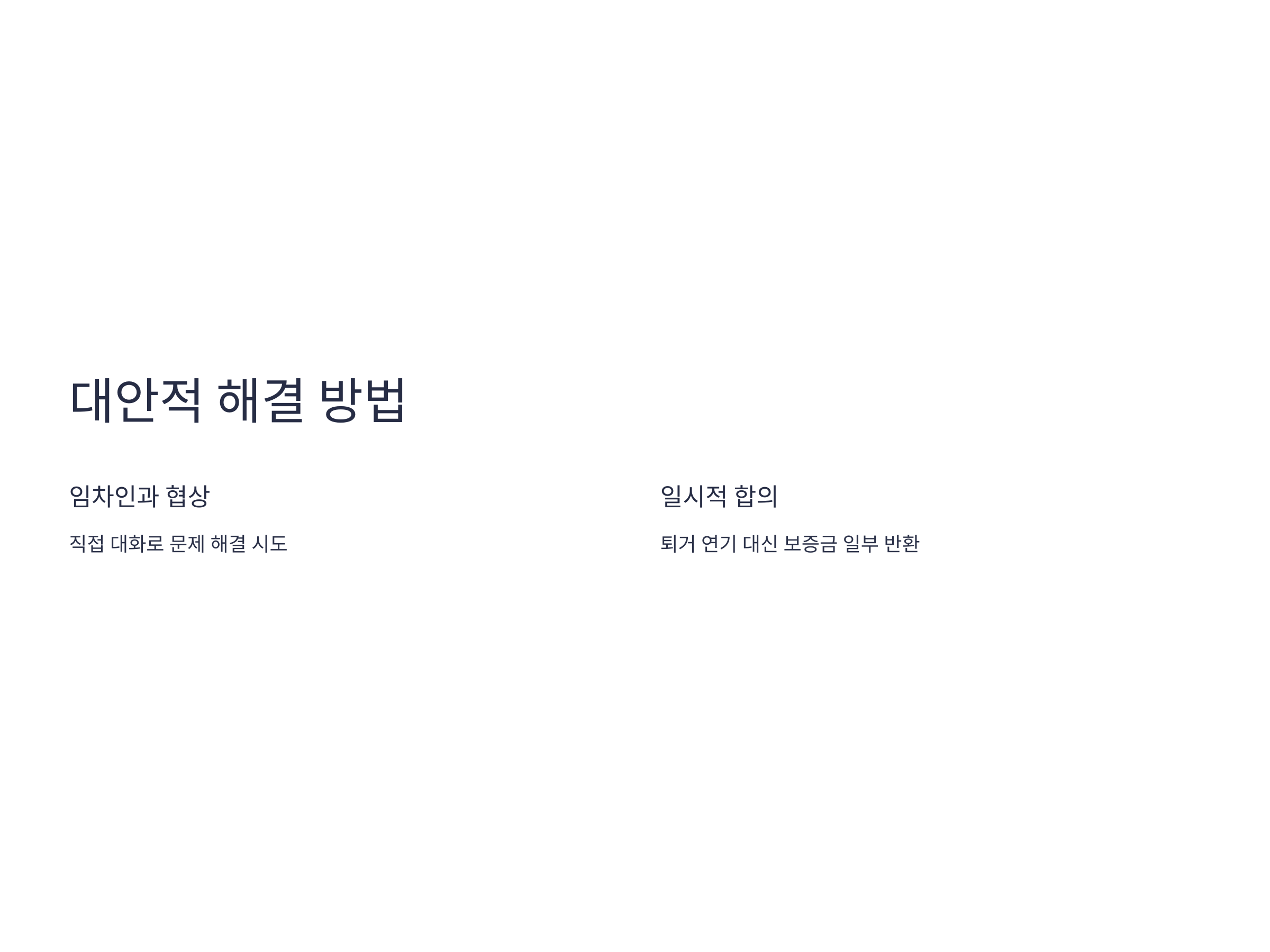- 임차인에게 일정 기간 동안 퇴거를 연기하는 대신, 퇴거 후에는 보증금을 일부 반환하거나, 새로운 거주지에 대한 지원을 제공할 수 있습니다. 이와 같은 일시적인 합의를 통해 임차인이 자발적으로 퇴거할 수 있게 유도할 수 있습니다.