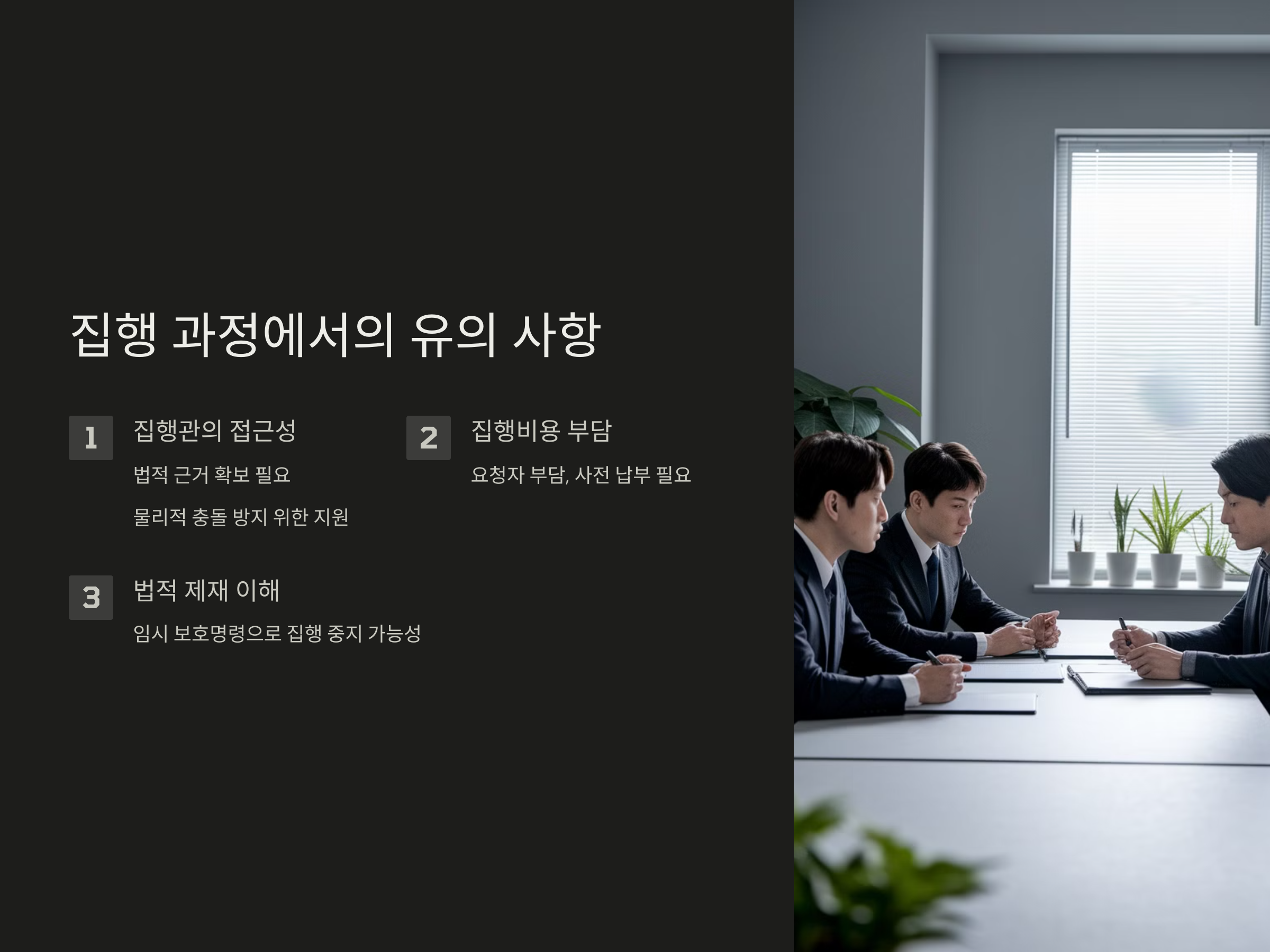 이와 같은 요소를 고려해 강제집행을 신중하게 진행해야 합니다. 불필요한 법적 분쟁을 피하기 위해, 관련 법률 전문가의 도움을 받는 것도 좋은 방법입니다.