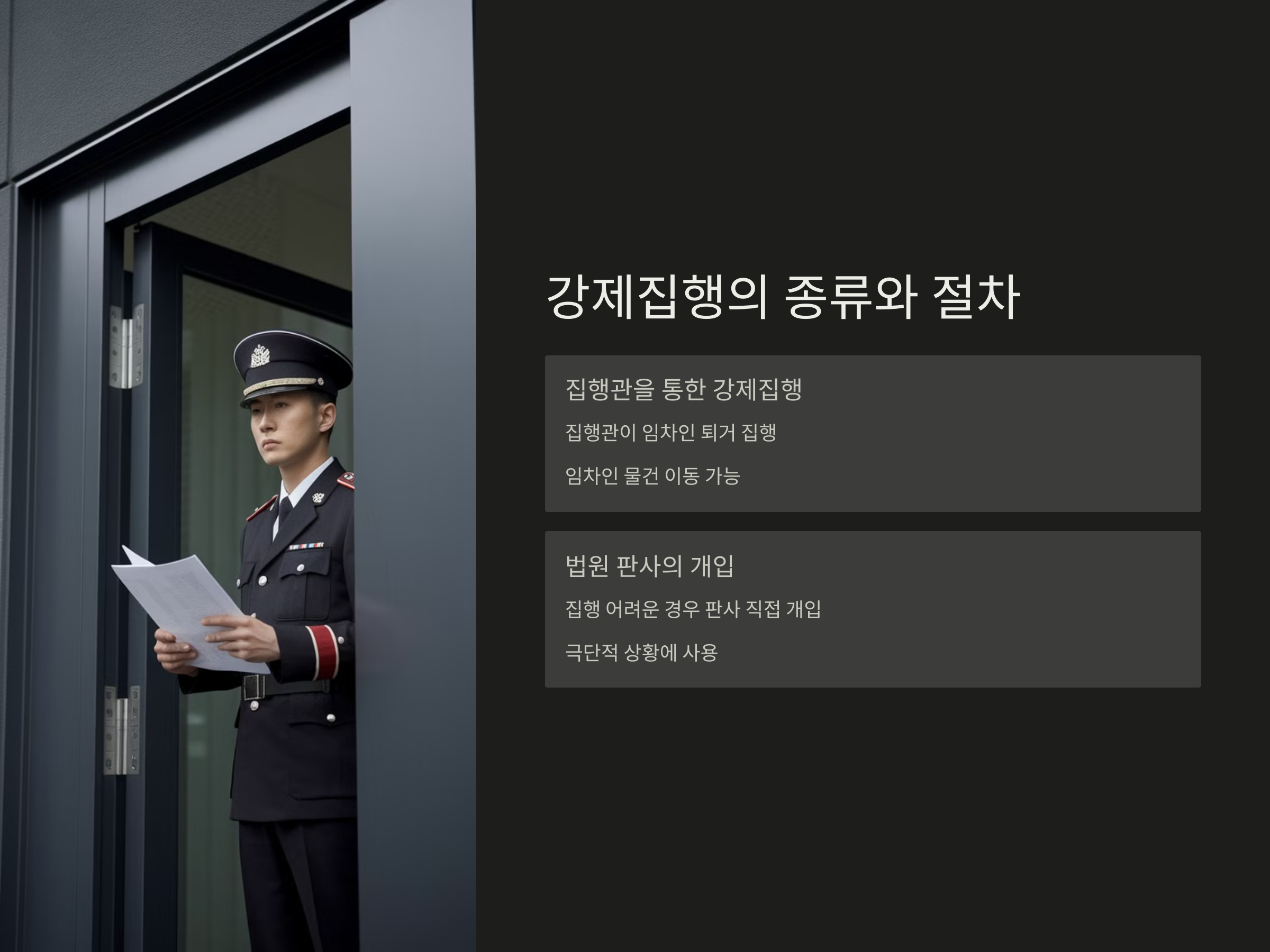 - 법원 판사의 개입: 집행관의 집행이 어려운 경우, 법원 판사가 직접 개입하여 퇴거 명령을 내릴 수 있습니다. 이는 보다 극단적인 상황에서 사용되며, 판사는 사건을 직접 다루게 됩니다.