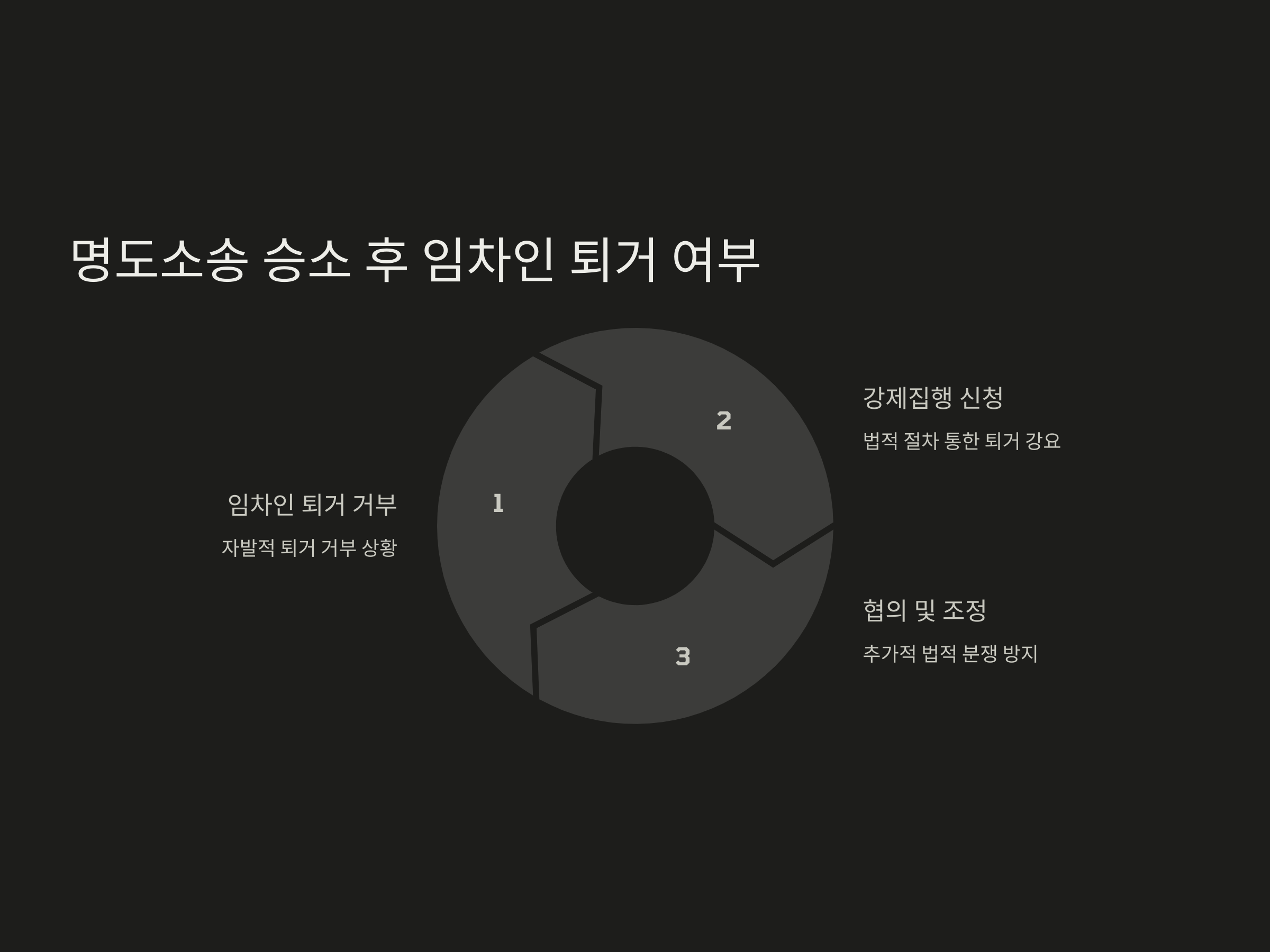 명도소송에서 승소를 하게 되면, 법원은 일반적으로 명도 판결을 내리게 됩니다. 그러나 이 판결이 곧바로 임차인 퇴거를 의미하지는 않습니다. 명도소송 승소 후 집행 절차는 판결을 실제로 강제 집행하는 단계로 나누어집니다. 집행 과정은 일반적으로 세 가지 주요 단계로 구분할 수 있습니다: