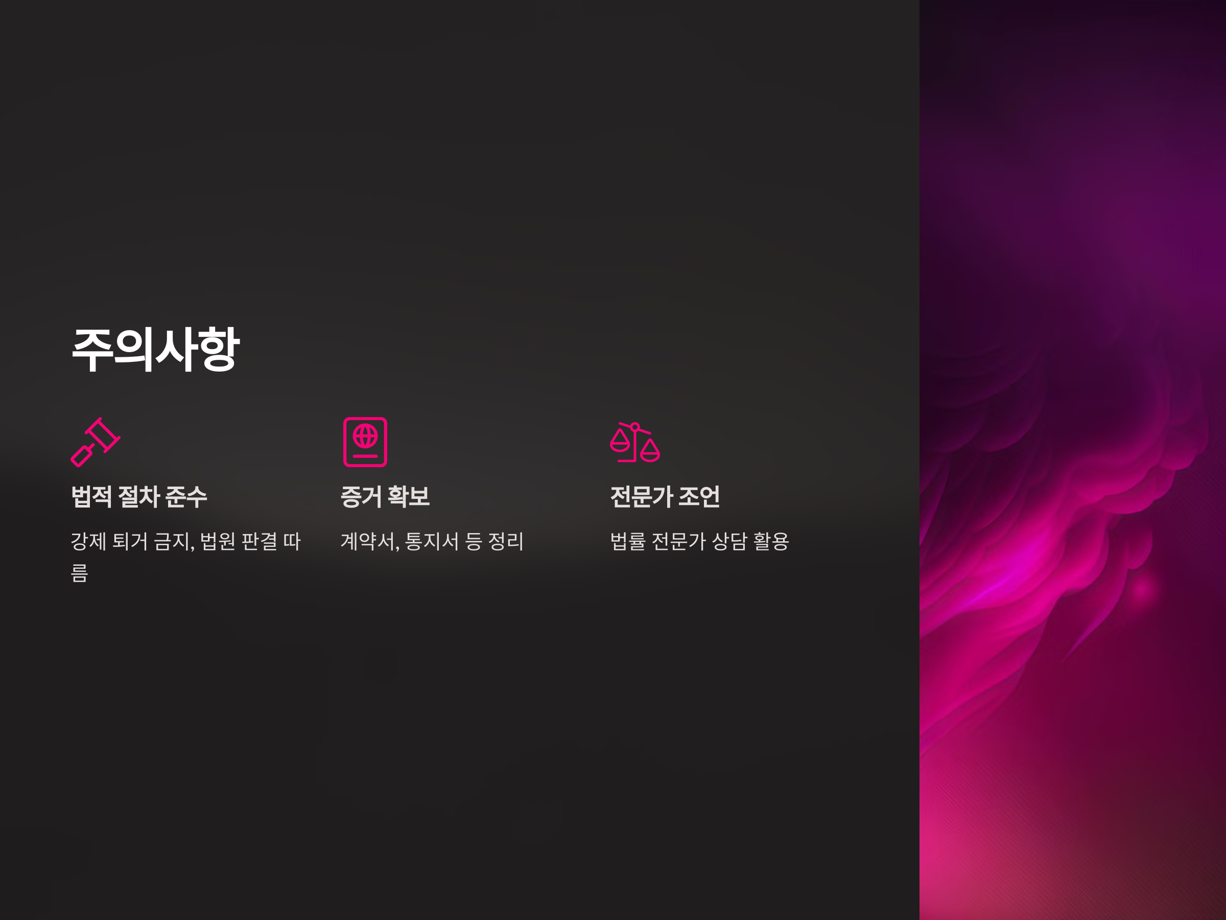 임대인은 강제로 임차인을 퇴거시키기 전에 법적 절차를 철저히 따르도록 해야 합니다. 법을 무시하고 임차인을 강제로 퇴거시키면 불법적인 행동이 될 수 있으며, 이에 따른 법적 책임을 질 수 있습니다. 항상 법원 판결과 강제집행 절차를 통해 퇴거를 진행해야 합니다.