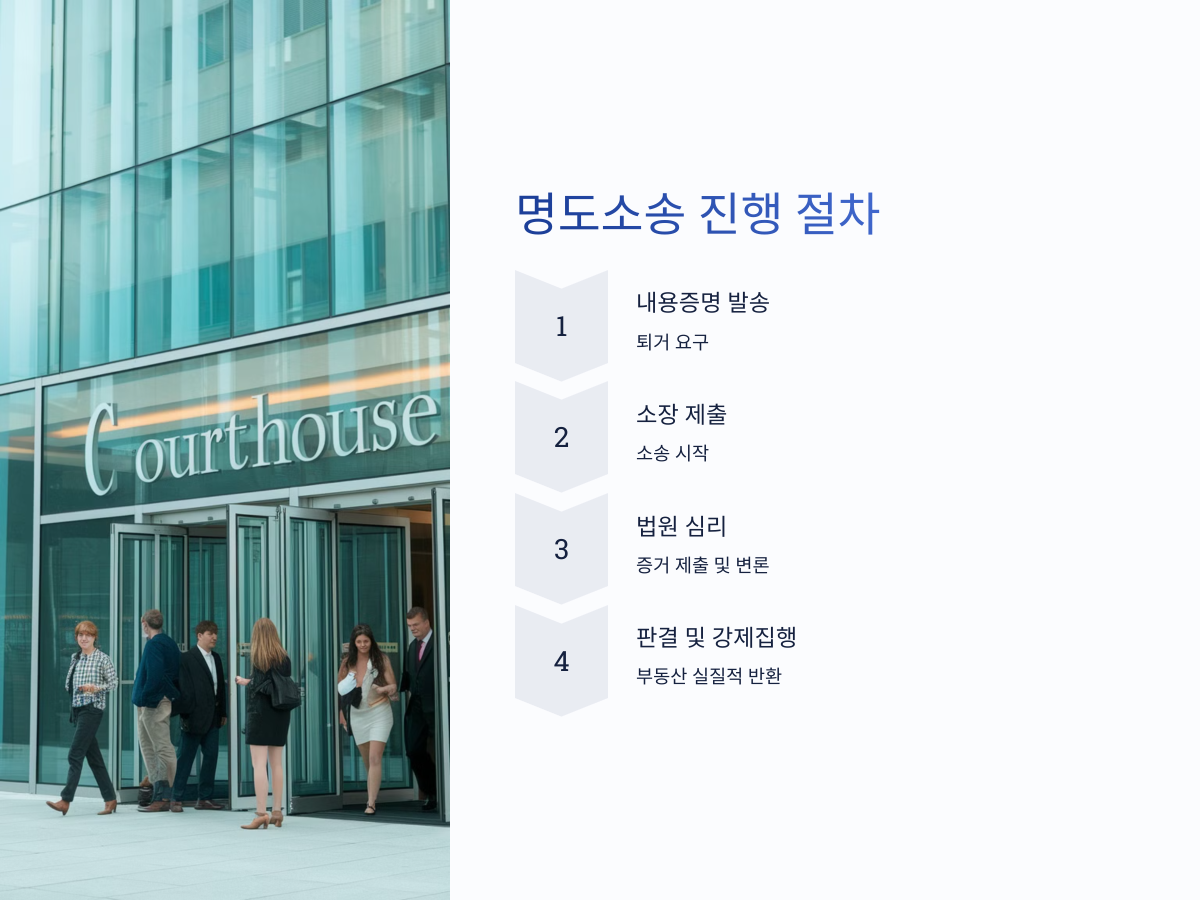 명도소송은 사전 준비부터 판결 후 강제집행까지 체계적으로 진행됩니다. 우선 내용증명을 통해 점유자에게 퇴거를 요구하고, 이에 응하지 않으면 소장을 제출해 소송을 시작합니다. 법원에서는 심리를 거쳐 판결을 내리고, 승소 후 강제집행을 통해 실질적으로 부동산을 반환받게 됩니다. 이 모든 과정에서 변호사의 역할은 절대적이며, 특히 강제집행 단계에서 법적 하자를 방지하기 위해 철저한 준비가 필요합니다. 이러한 절차를 순차적으로 이해하고 준비해야 명도소송에서 성공할 수 있습니다.