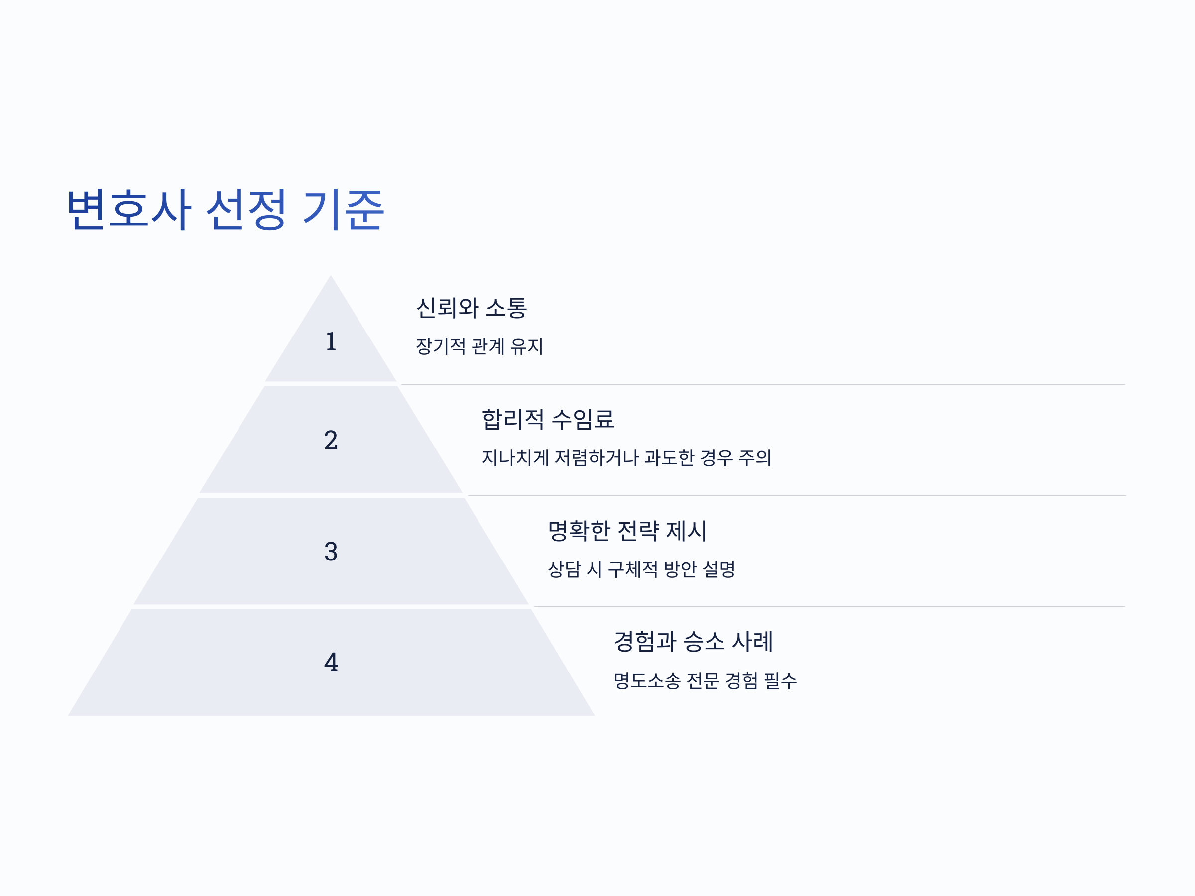 명도소송 전문변호사를 선정할 때 가장 먼저 고려해야 할 것은 경험과 승소 사례입니다. 명도소송만을 집중적으로 다뤄온 변호사는 판례에 익숙하고, 예상치 못한 변수에 강합니다. 또한, 명확한 상담과 소송 전략을 제시할 수 있는지를 통해 그 역량을 평가할 수 있습니다. 수임료 역시 중요 요소인데, 지나치게 저렴하거나 과도하게 비싼 경우에는 주의가 필요합니다. 최종적으로는 고객과의 소통 능력과 신뢰성을 기반으로 장기적인 관계를 유지할 수 있는 변호사를 찾는 것이 중요합니다.