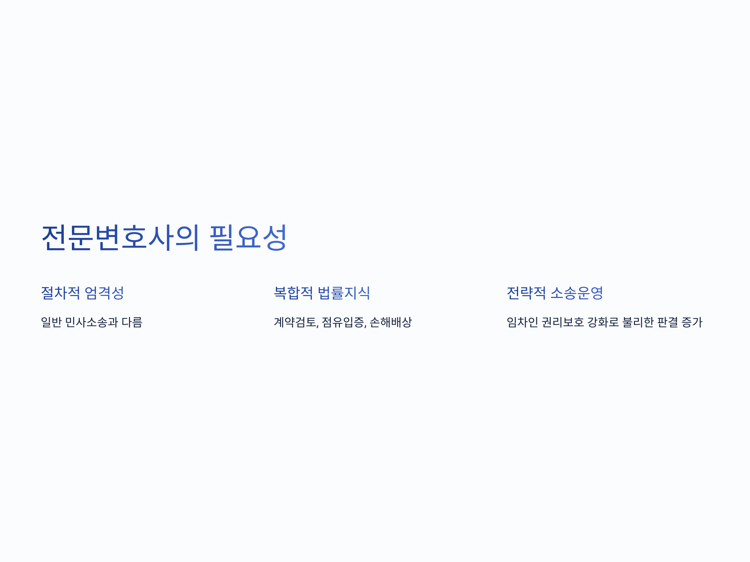 명도소송은 단순한 민사소송과 달리 절차적 엄격성이 요구되며, 실무 경험이 풍부한 변호사가 아닌 경우 패소할 가능성이 높습니다. 실제로 계약서 검토, 점유 사실 입증, 손해배상 청구 등 복합적인 법률 지식이 필요하기 때문에 명도소송 전문변호사를 선임하는 것이 필수적입니다. 특히 최근 임차인의 권리 보호 강화로 인해 임대인에게 불리한 판결이 증가하고 있어 전략적 소송 운영이 필요합니다. 전문변호사는 소송 전 합의 유도부터 판결 후 강제집행까지 전 과정에서 실질적인 도움을 제공하며, 시간과 비용을 절약하게 해줍니다.
