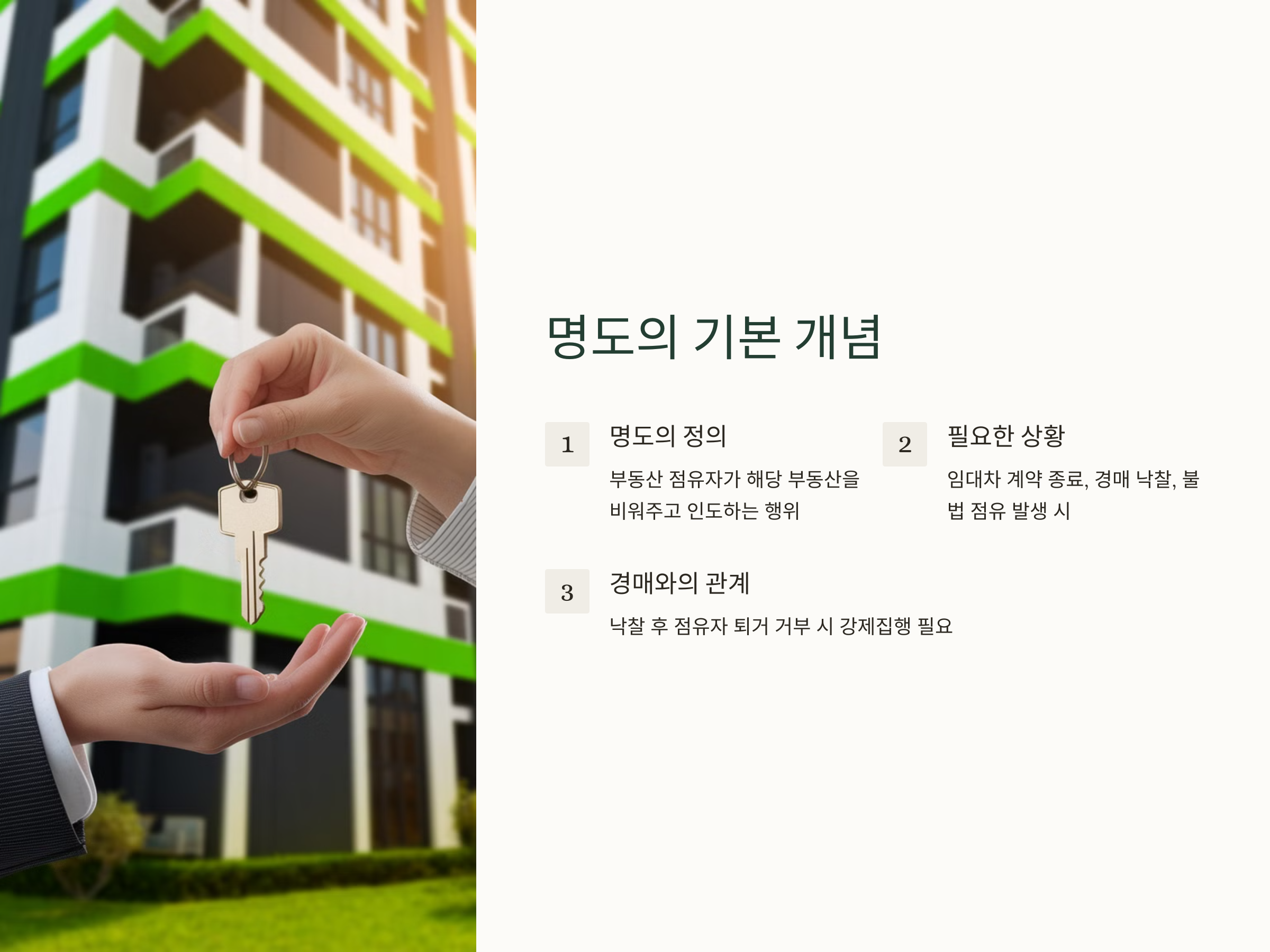 명도란 부동산을 점유하고 있는 사람이 해당 부동산을 비워주고 인도하는 행위를 의미합니다. 일반적으로 매매, 임대차 종료, 경매 낙찰 후 진행됩니다. 하지만 점유자가 자발적으로 부동산을 비워주지 않는 경우 강제집행을 통해 명도를 실행해야 합니다.