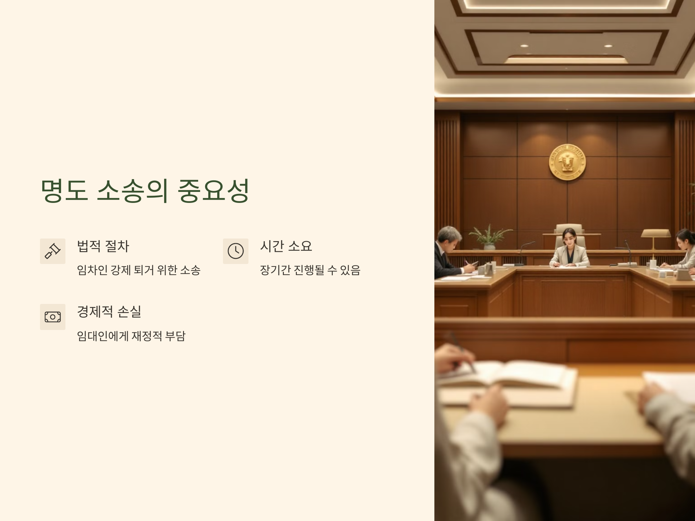 명도 소송은 임대차 계약이 종료되었음에도 불구하고 임차인이 임대 공간을 비우지 않는 경우, 임대인이 법원에 소송을 제기하여 임차인을 강제로 퇴거시키는 법적 절차입니다. 이 소송은 시간이 많이 소요될 수 있으며, 임대인에게 경제적 손실을 초래할 수 있습니다. 따라서 계약서에 명도 소송에 대한 명확한 규정이 있어야만 불필요한 분쟁을 예방할 수 있습니다.