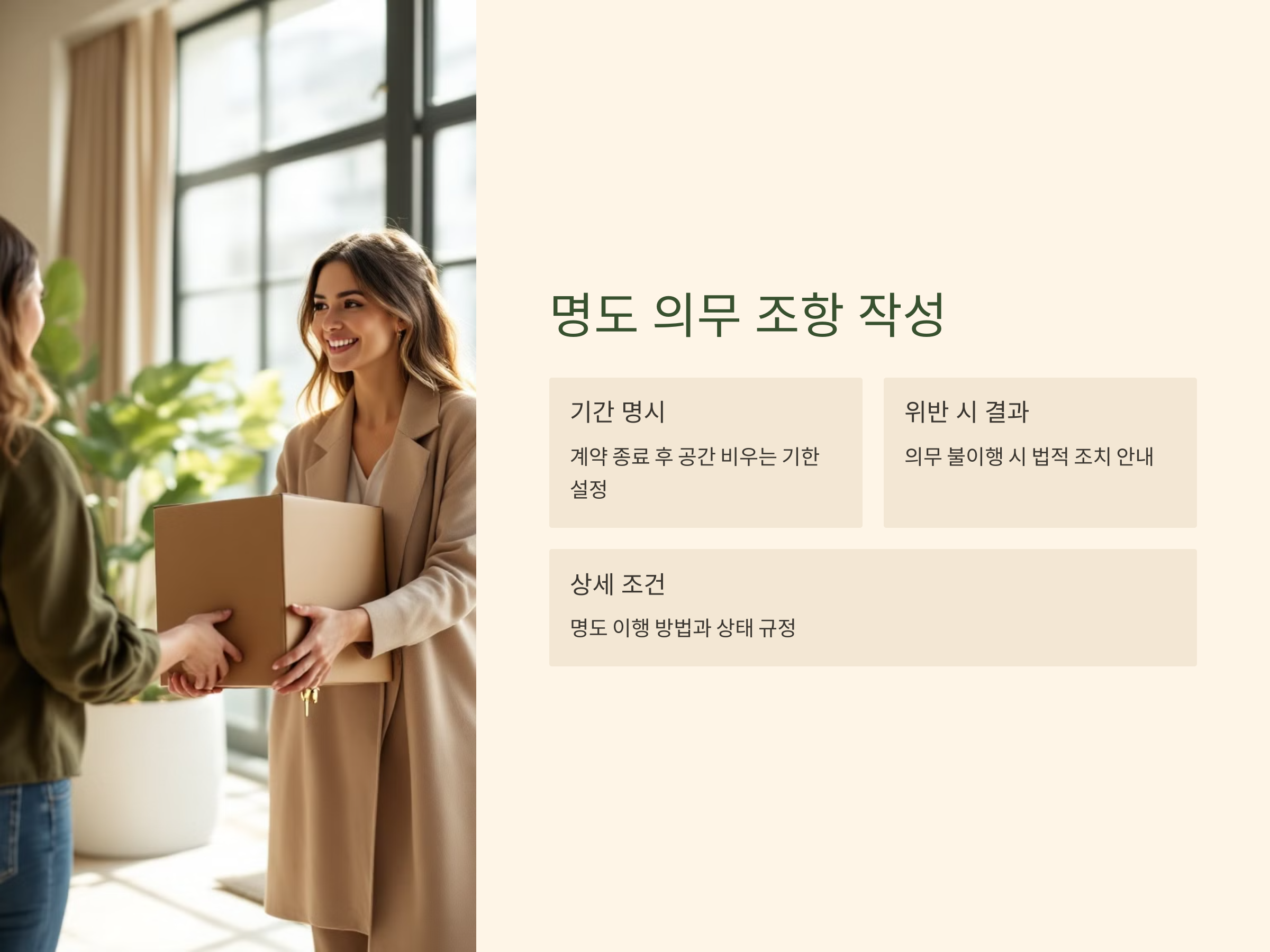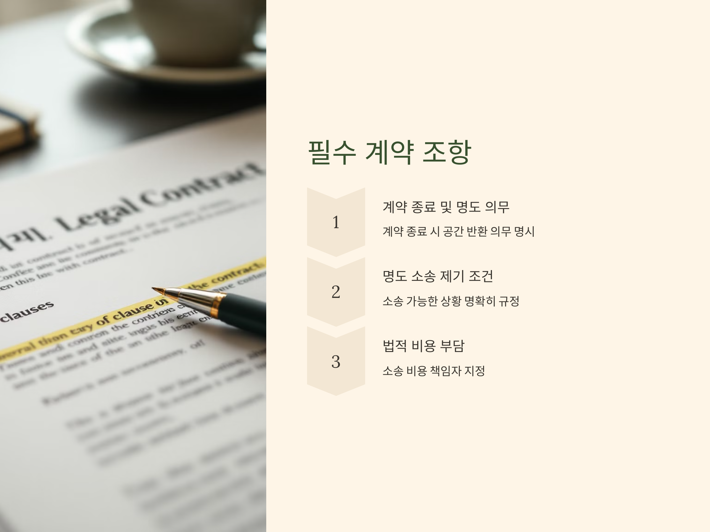 명도 소송 관련 계약서 조항을 작성할 때는 몇 가지 핵심 요소를 반드시 포함해야 합니다. 이를 통해 양측은 명도 소송에 대한 명확한 이해를 바탕으로 계약을 체결할 수 있습니다.