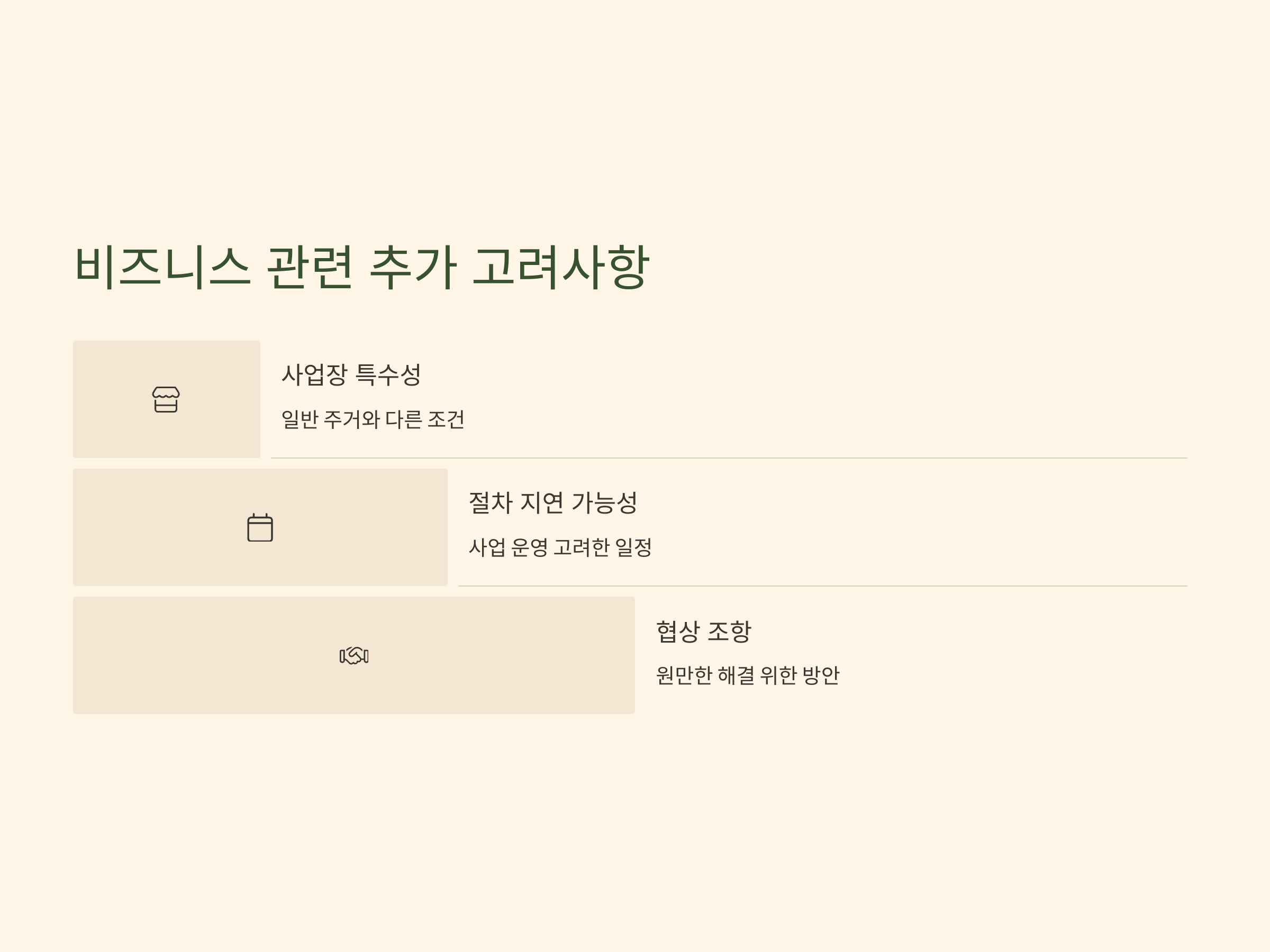 명도 소송과 관련된 조항을 추가적으로 고려할 때는 몇 가지 사항도 염두에 두어야 합니다. 예를 들어, 임차인이 사업을 운영하고 있을 경우, 사업장에 대한 명도 소송이 더욱 복잡할 수 있습니다. 이런 경우에는 사업 운영에 대한 별도의 규정을 추가하여 명확히 해야 합니다.