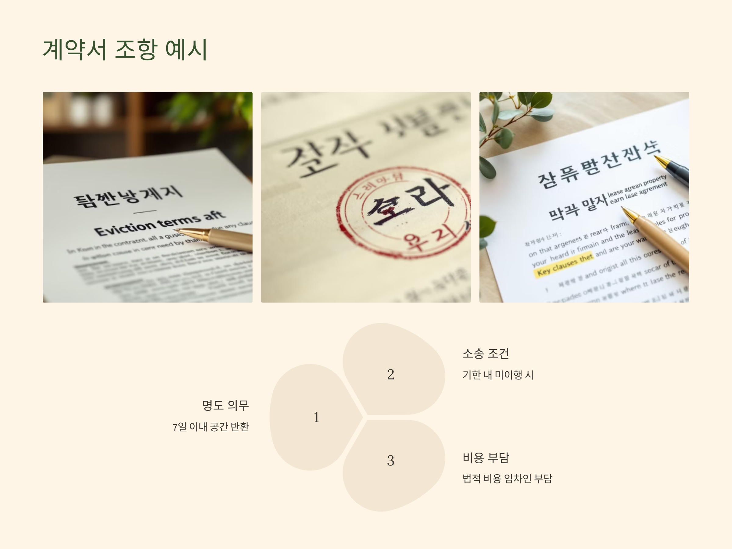 - 법적 비용: "명도 소송에 따른 모든 법적 비용은 임차인이 부담한다."