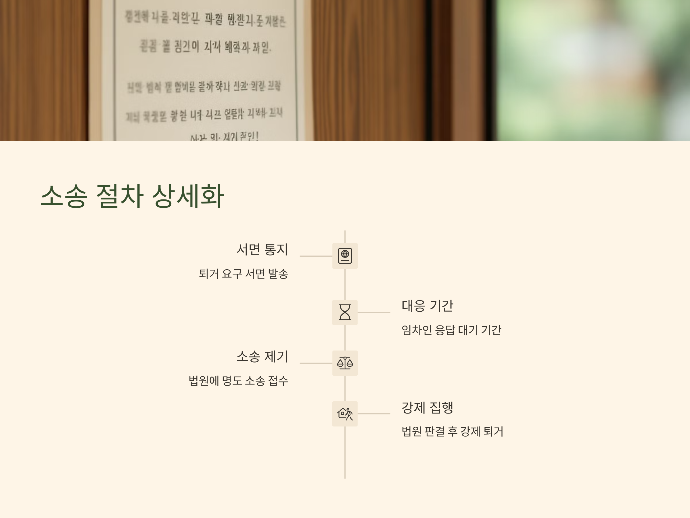 명도 소송 절차를 상세히 규정하는 것도 중요합니다. 이는 임대인이 소송을 제기하기 전후에 어떤 절차를 거쳐야 하는지에 대해 임차인에게 명확히 안내하는 것입니다. 예를 들어, "임대인은 소송을 제기하기 전, 임차인에게 서면으로 퇴거를 요구하고, 7일 이내에 응답이 없을 경우 법적 절차를 진행한다"는 내용을 추가할 수 있습니다.